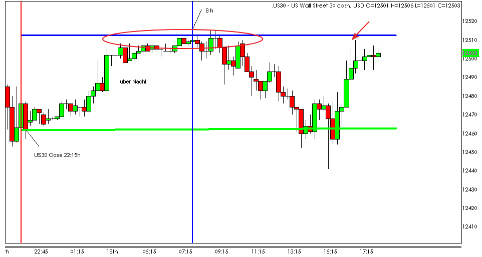 Diese "kleinen" Differenzen werden bei Nutzung unterschiedlicher Finanzinstrumente und Data Feed immer wieder auftreten . Wie bei Vorstellung bereits erkärt, werden in die Charts Kurse der DE30 und US30 eingestellt. Außerdem steige ich antizipativ aus guten Gründen bis zu 5 Punkte mit Marketorder früher ein und zwar deshalb weil sehr, sehr oft der Kurs die Zone kurz berührt oder 2 Punkte vorher dreht. Auch heute . Siehe eingefügter Chart. Bei Zweifel: Einstieg mit Umkehrkerze.