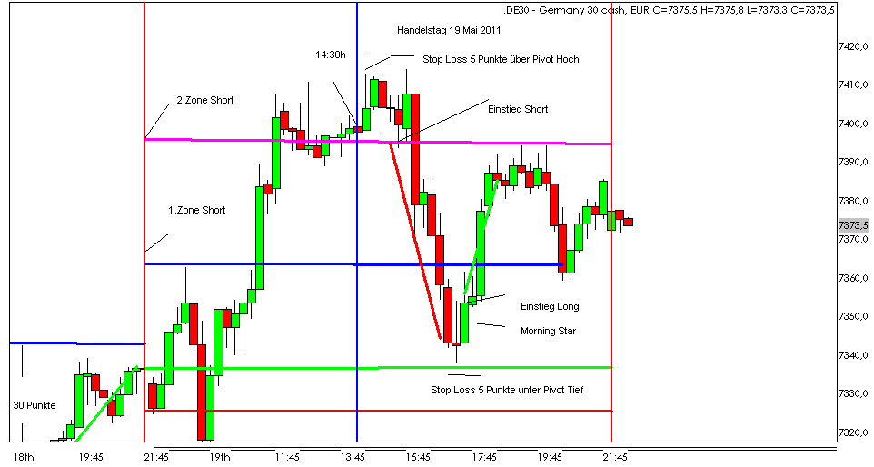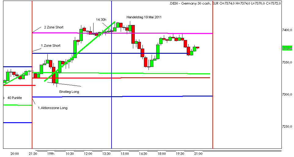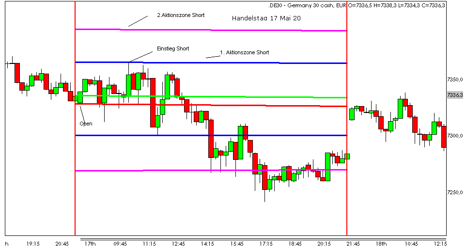 (über Eröffnungskurs) erfolgt der Einstieg bis mittags nach dem der Kurs von unten nach oben in Richtung der Aktionszonen tendiert. Nachmittags erfolgt der Einstieg Short wenn der Kurs von oben nach unten gehandelt wird.