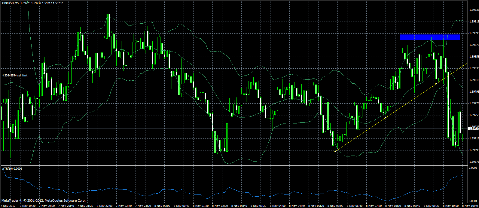 Trendlinie (gelb) gebrochen, davor eine Zone (blaues Rechteck), in der keine neuen Hochs zustande kamen, Versuch short 1,5982 (Wert läßt sich als Widerstandslinie interpretieren) SL (untypisch) 1,5995 + 2 pips spread = 1,5997 (um bei Rücksetzer zum Pivot und temporärem Hoch aus Nachtphase nicht zum Opfer zu fallen, wohl wissend, dass 1,6000 das Genick brechen würde), TP = Tagestief; Zeitstopp 10:25, da 10:30 Handelsbilanzsaldo veröffentlicht wird. -