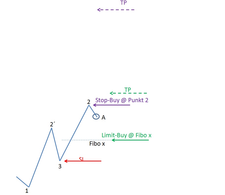 3- Bei einem Unterschreiten vomPunkt 3 ist die Trade-Idee hinfällig --> ich nehem Punkt 3 als SL.