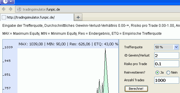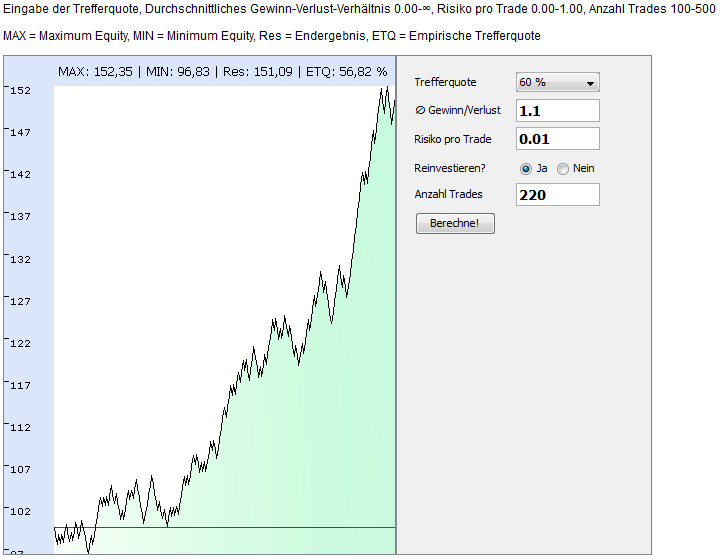 mit 100-500 Trades austesten kann. Der Simulator zieht eine Folge von 0-1-Variablen, die gemäß der Trefferquote verteilt sind.