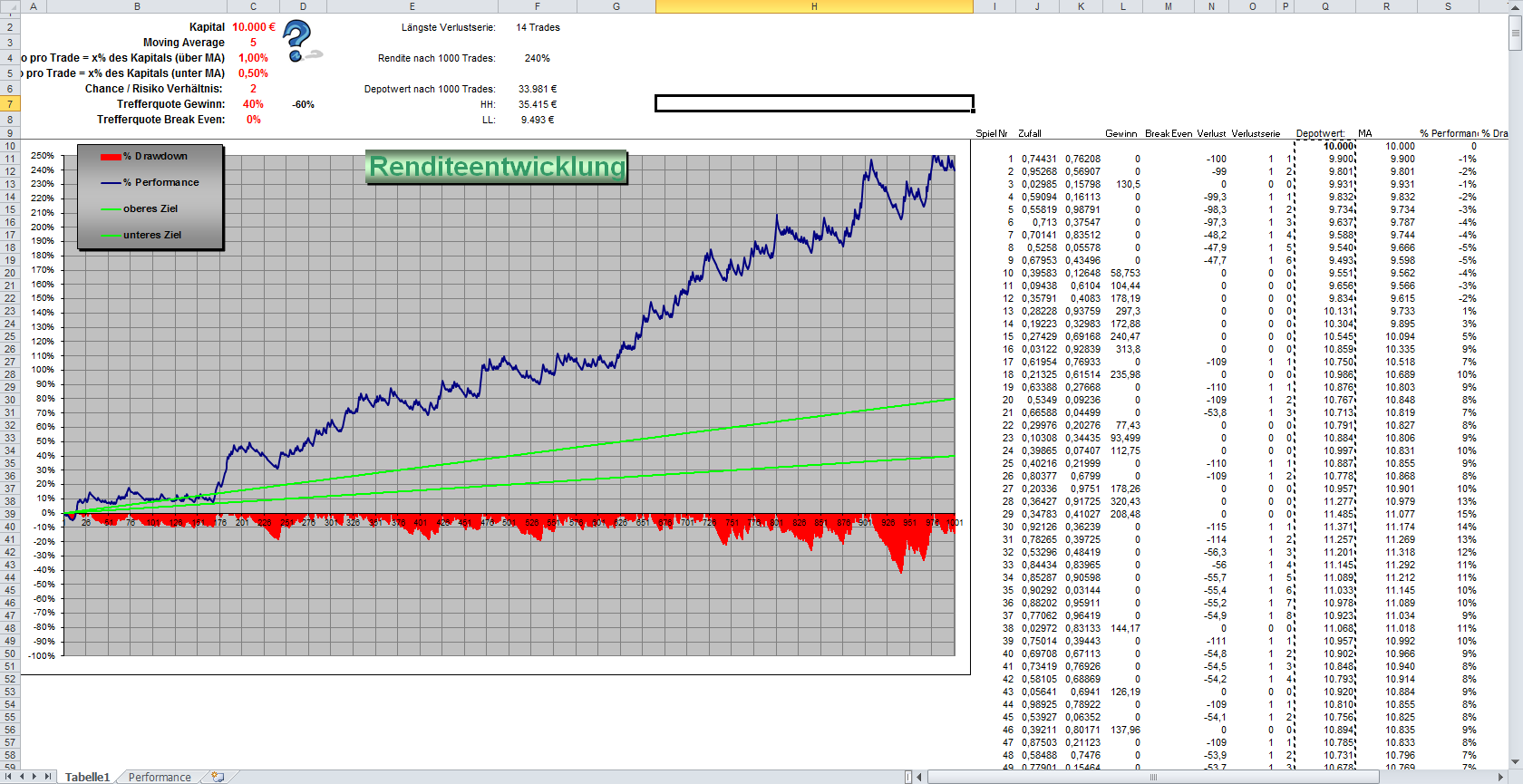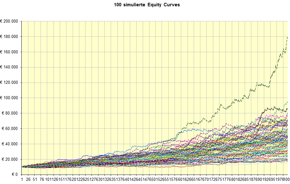 Bei jeder Änderung der Tradezahl wird eine neue Stichprobe gezogen. Ändert man nur das Gewinn-Verlust-Verhältnis oder das Risiko, so wird dieselbe Tradefolge verwendet.