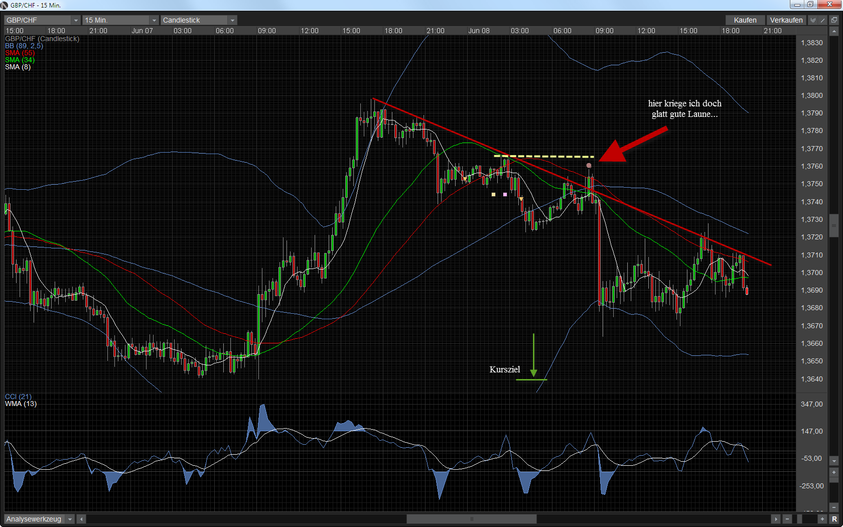 Wäre der Stopp hinter der gelben Linie gelegen, wäre der Markt sicherlich auch noch dahin gekrochen (Anfängergejammer). Und auf dem Mond will ich auch keine Stopps setzen.