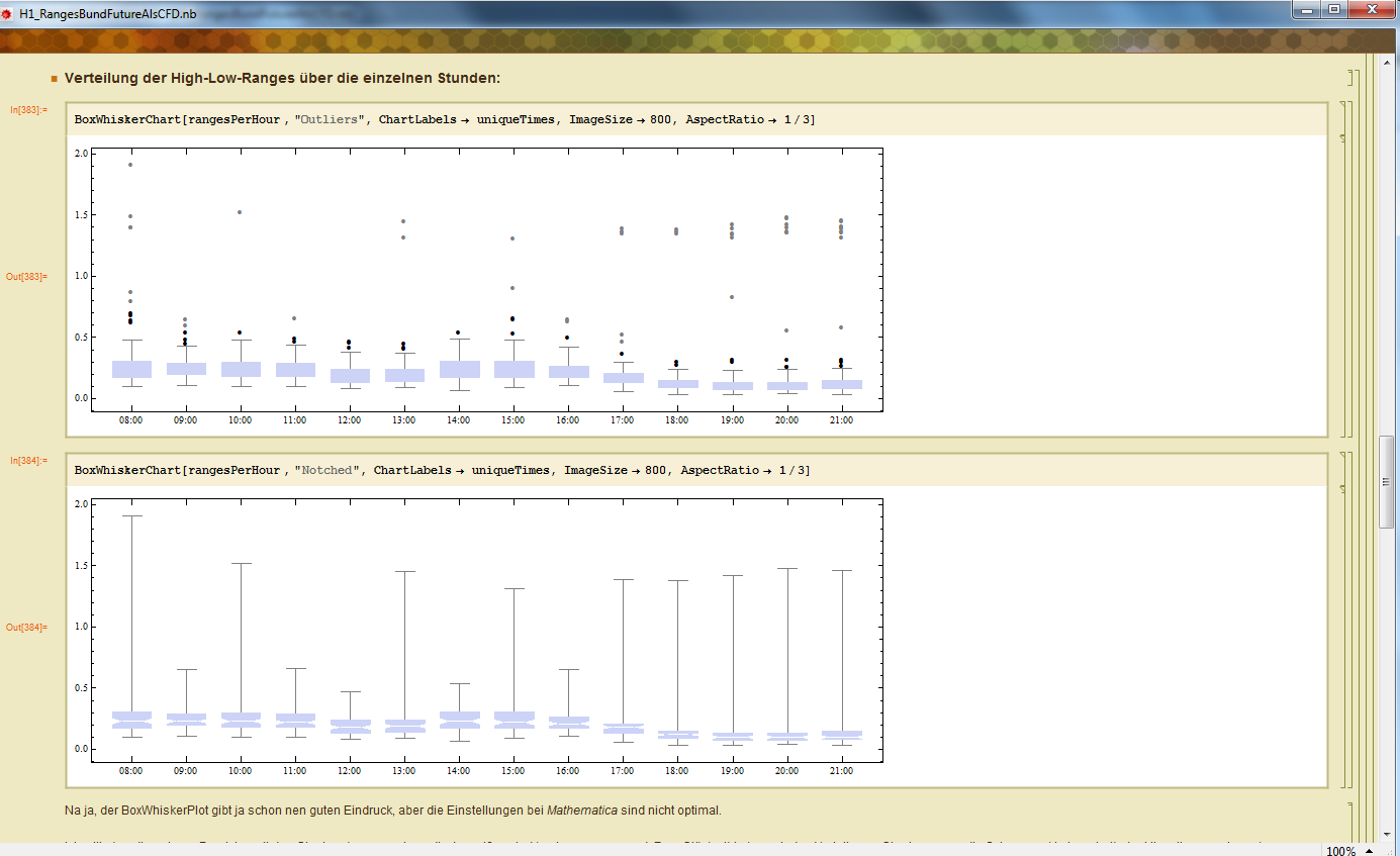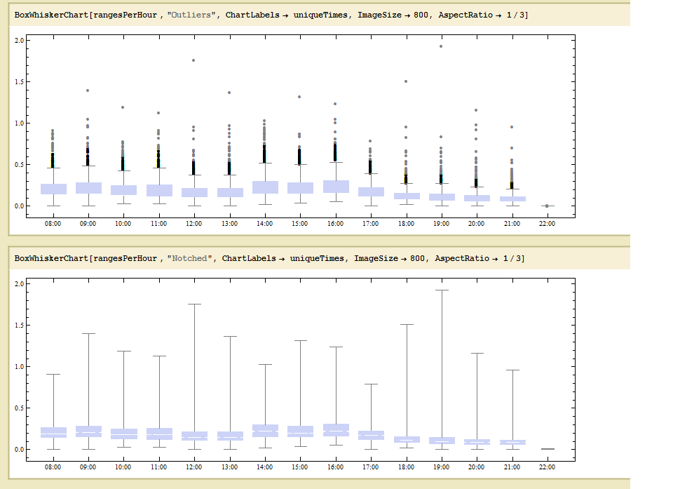 Violin Plots sehen m. E. informativer und harmonischer aus. Sie gehen auch in Mathematica mit der Funktion DistributionChart[].