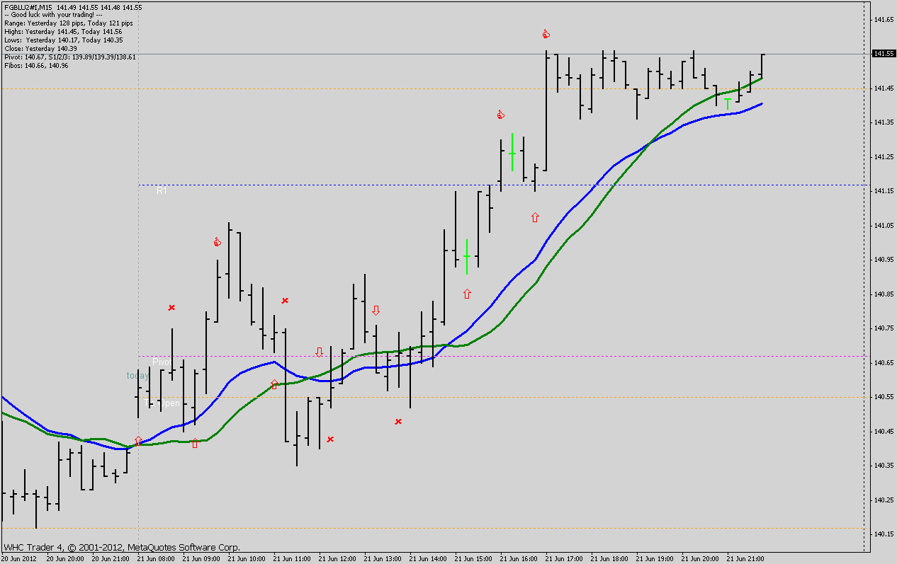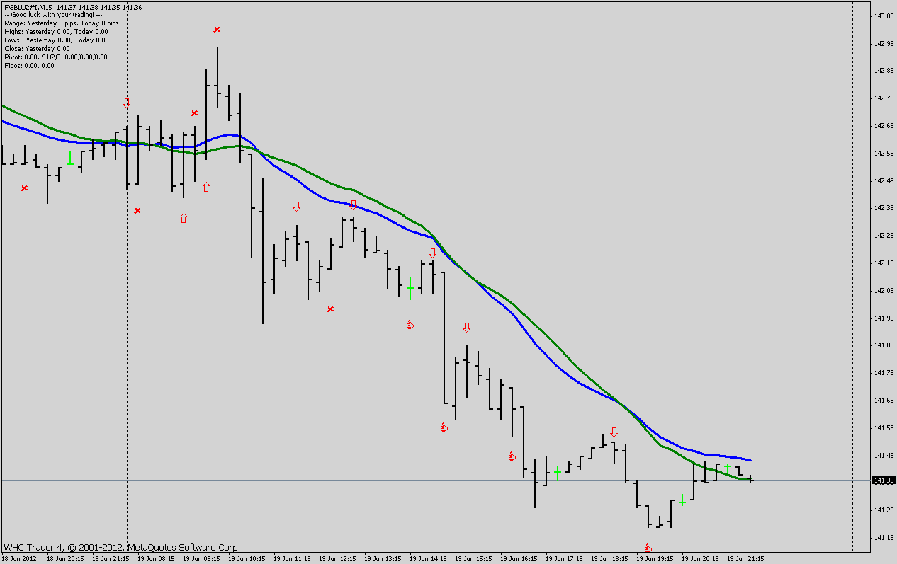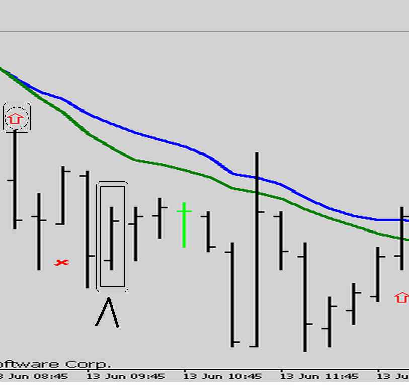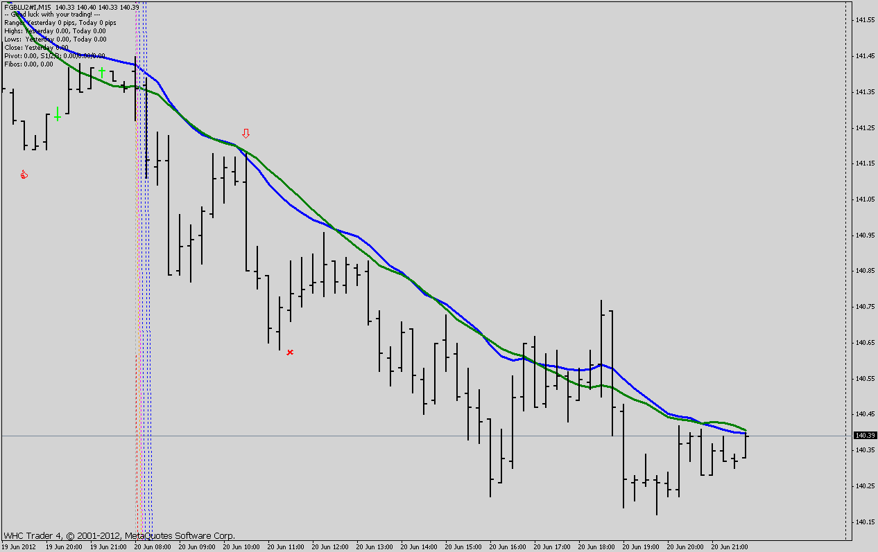 - 2 Indikatoren - EMA20 ( blau ) und SMA20 ( grün ) zur Trendbestimmung