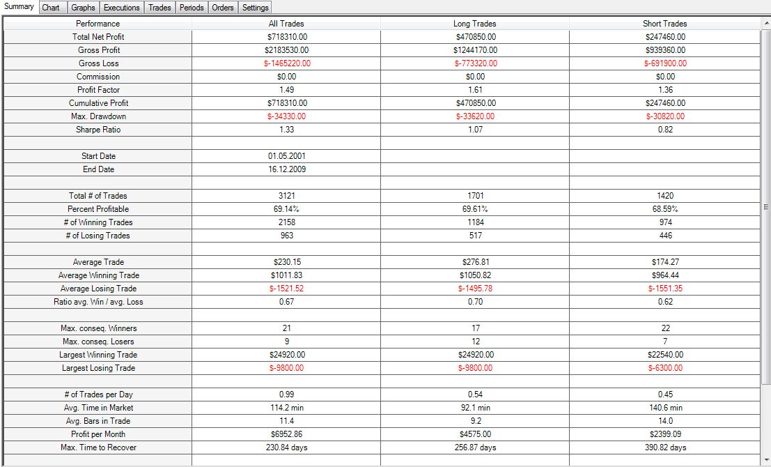 Bezüglich Daten-Müll: Die relativ konstante Perfomance schliesst kleinere falsche Daten aus. Die grössten Gewinntrades wurden nachkontrolliert und es lässt sich nichts Spezielles erkenne. Und da Positionen immer zum nächsten Close eröffnet oder geschlossen werden, ist es im FDAX auch sehr wahrscheinlich, dass man zumindest mit wenigen Kontrakten einen sehr guten Fill bekommt. -