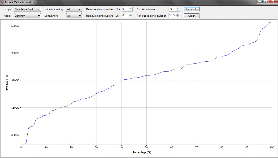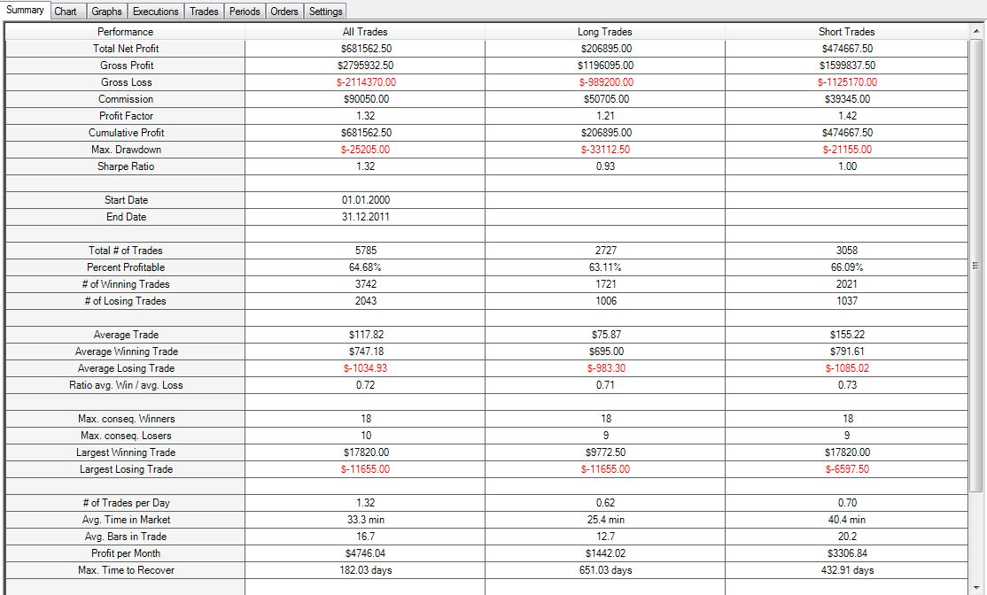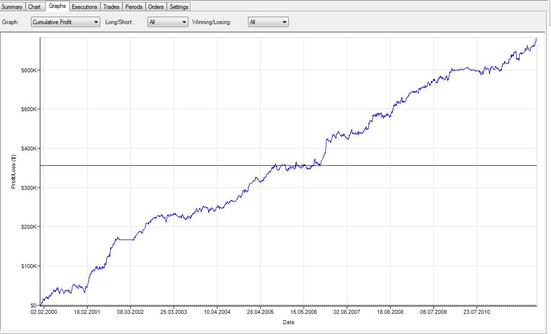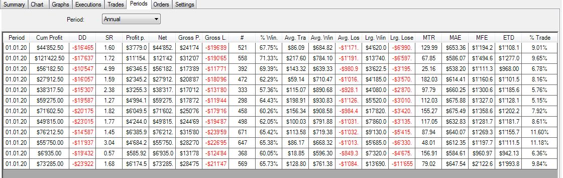 Bezüglich Daten-Müll: Die relativ konstante Perfomance schliesst kleinere falsche Daten aus. Die grössten Gewinntrades wurden nachkontrolliert und es lässt sich nichts Spezielles erkenne. Und da Positionen immer zum nächsten Close eröffnet oder geschlossen werden, ist es im FDAX auch sehr wahrscheinlich, dass man zumindest mit wenigen Kontrakten einen sehr guten Fill bekommt. -