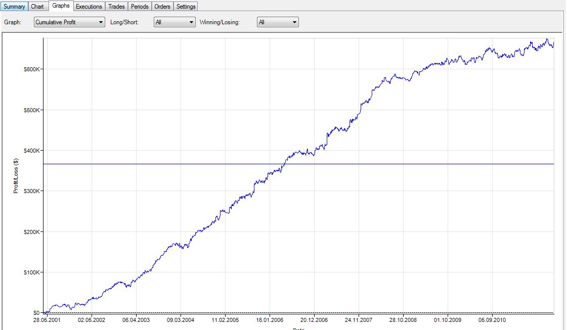 Als ich dann von einem CFD-Broker zu IB mit Ninjatrader wechselte, hatte ich plötzlich deutlich mehr Möglichkeiten. Ich konnte somit meine Strategie programmieren und einigermassen realistisch Backtesten. Der Backtest der Strategie im FDAX ist gut genug für mich um die Strategie nun komplett automatisch handeln zu lassen. Ich bin überzeugt, dass es Leute hier gibt, die eine bessere Strategie haben. Aber die Strategie macht relativ konstant Gewinne in unterschiedlichen Marktphasen (FDAX) mit vertretbarem DD. Gut genug um den "Roboter" zu aktivieren. Was aber nicht ausschliesst später noch bessere Systeme für den FDAX zu entwickeln.