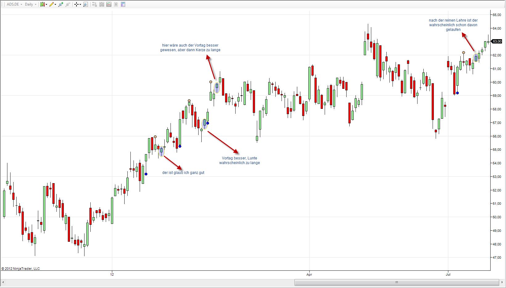 Einer der auffälligsten Punkte ist, das die Signalkerze nicht unbedingt der tiefste Punkt seit dem letzten Hoch ist. Dies ist aber für Hintman, sofern ich alles richtig verstanden habe aber schon wichtig.