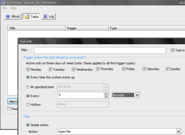 Taskplaner von Windows kann nur ab täglich, soweit ich weiß. Außerdem habe ich den deaktiviert. Dem dummen Träschle fiel dann aber just in dem Augenblick deines Postings ein (Stirnbatschattacken incl.), dass er ja bereits einen alternativen besseren Freeware Taskplaner namens Firetask auf einer Partition (vor Monaten) platziert hat. Und siehe da, der kann im Sekundenintervalbereich sogar Frauen, die ihn brauchen, beglücken.