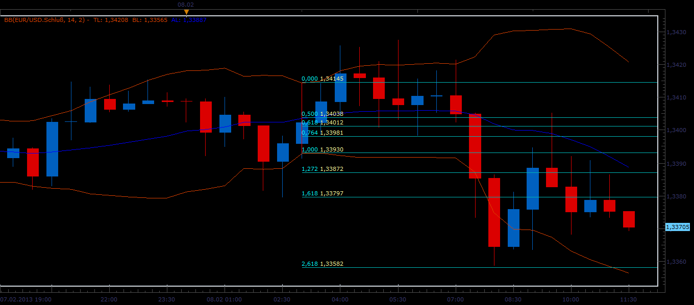 Mir hilft zur Zielbestimmung (meist 262, auch 424, je nach Länge der Ausbruchskerze) folgende Vorgehensweise, indem ich völlig unüblich bei bestimmten Bollinger-Bänder Verengungen an der schmalsten Stelle die Fibos anlege: