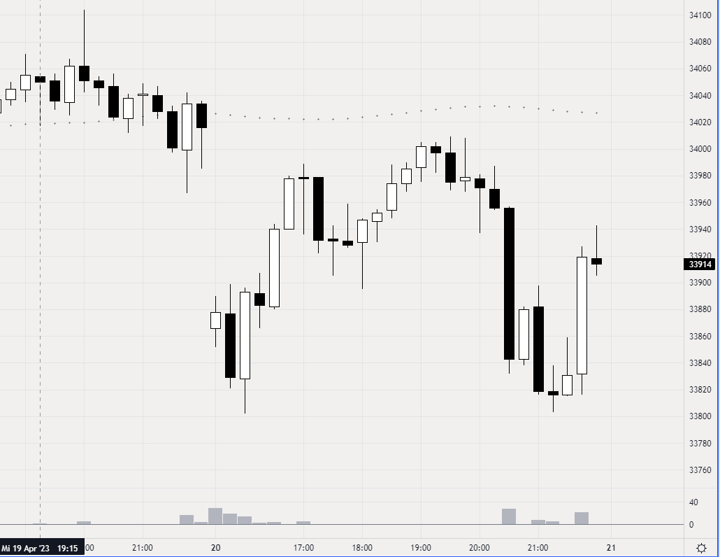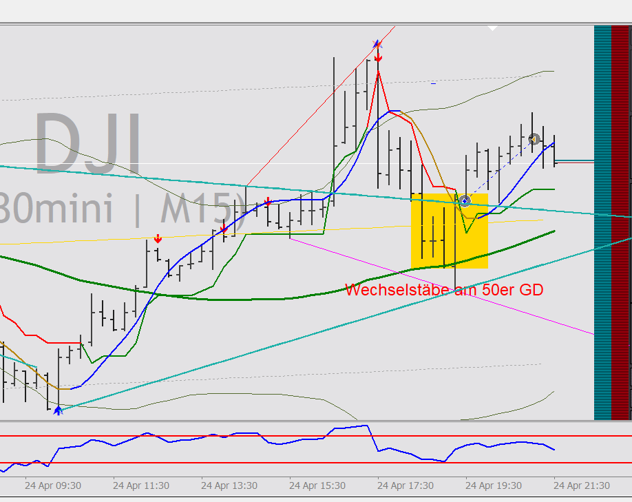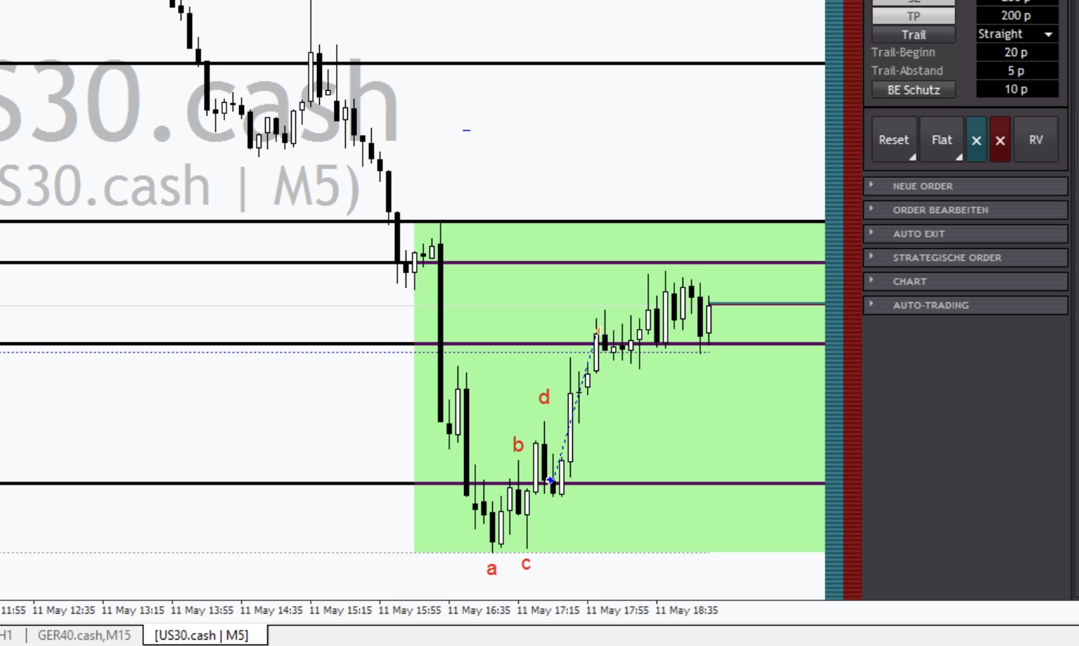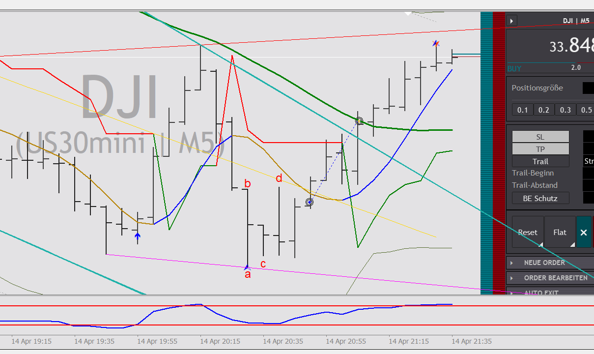 Ein Beispiel von heute Nachmittag aus dem DOW - M5: Eine wunderschöne ABCD-Formation (da sehr kurz aus nur 4 Stäben bestehend) ist fachgerecht ausgebrochen. -
