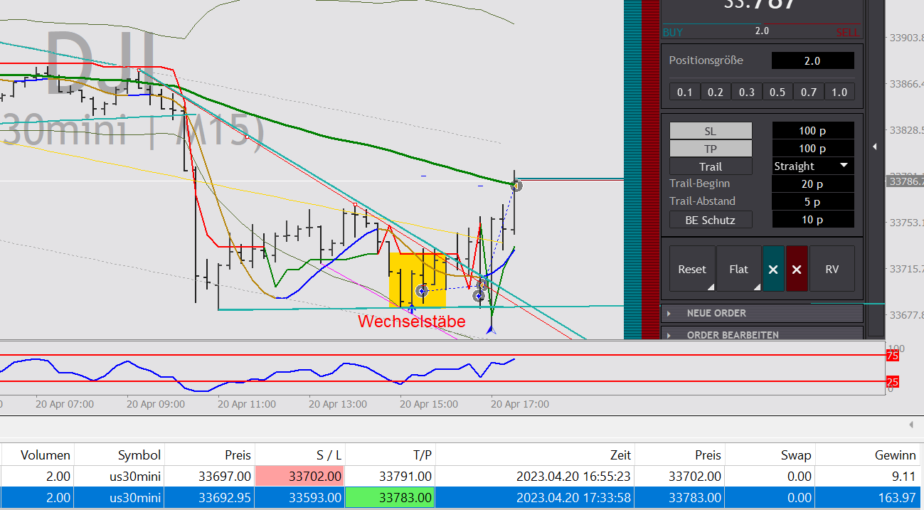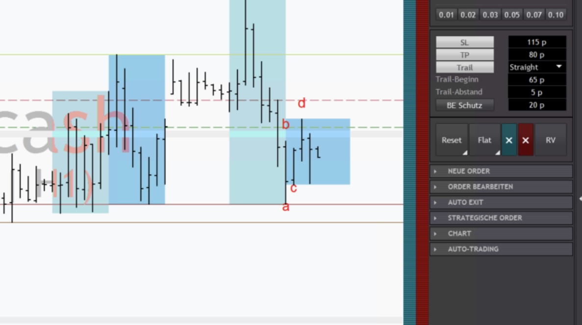 Meine erste Position ist nach Absicherung ausgestopt worden. Der Re-Entry lief dann in den erwarteten Gewinn. Um solch einen Re-Entry einzusetzen, gehört viel Erfahrung im Handel mit Dathes Formationen dazu. -