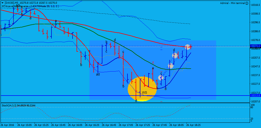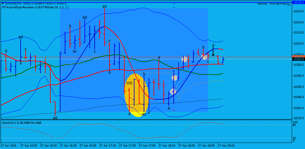 Somit ergab sich im M5 heute Nachmittag eine gute LONGGelegenheit nach Wechselstäben mit Punkt d (rot). Auch die Stochastik war passend vorher im unteren Extrembereich und alle Schlusskurse über der blauen Linie. Somit ergab sich ein recht sicheres SetUp, welches man mit einer größeren Positionsgröße Traden kann.