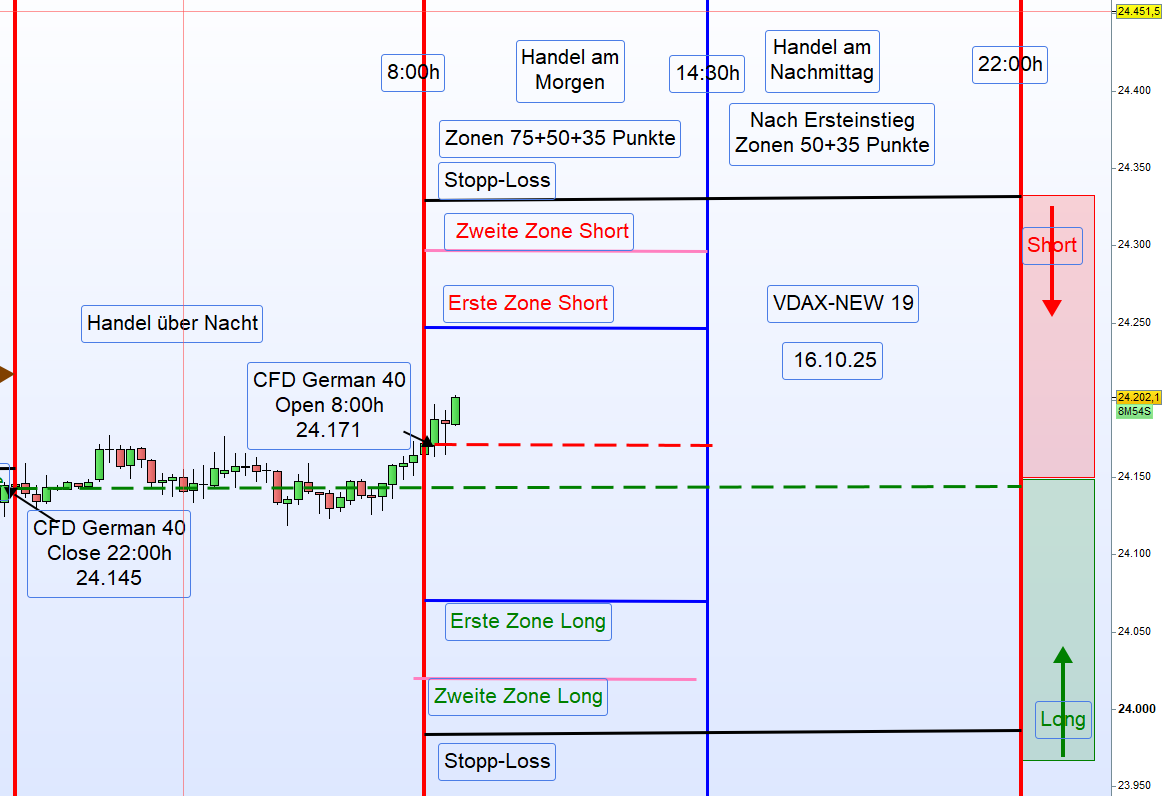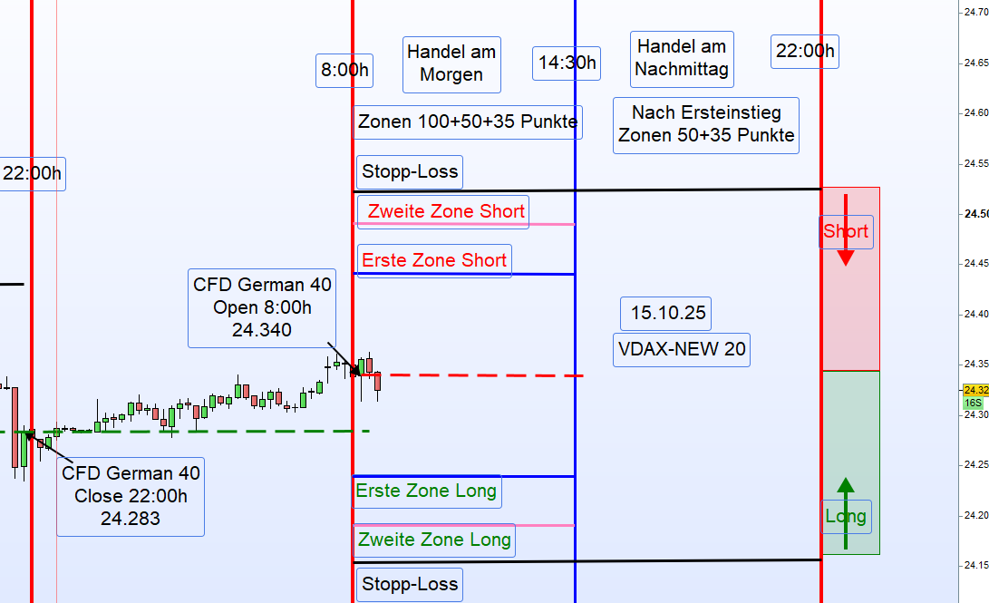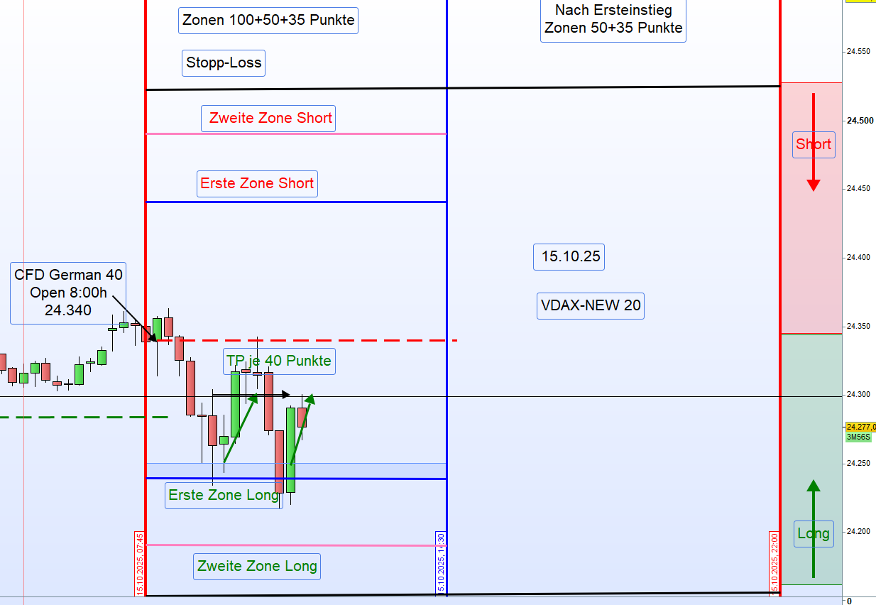 Durch die erhöhte Volatilität (VDAX ~20) bleiben wir heute besonders aufmerksam, was Fehlausbrüche und schnelle Richtungswechsel betrifft.