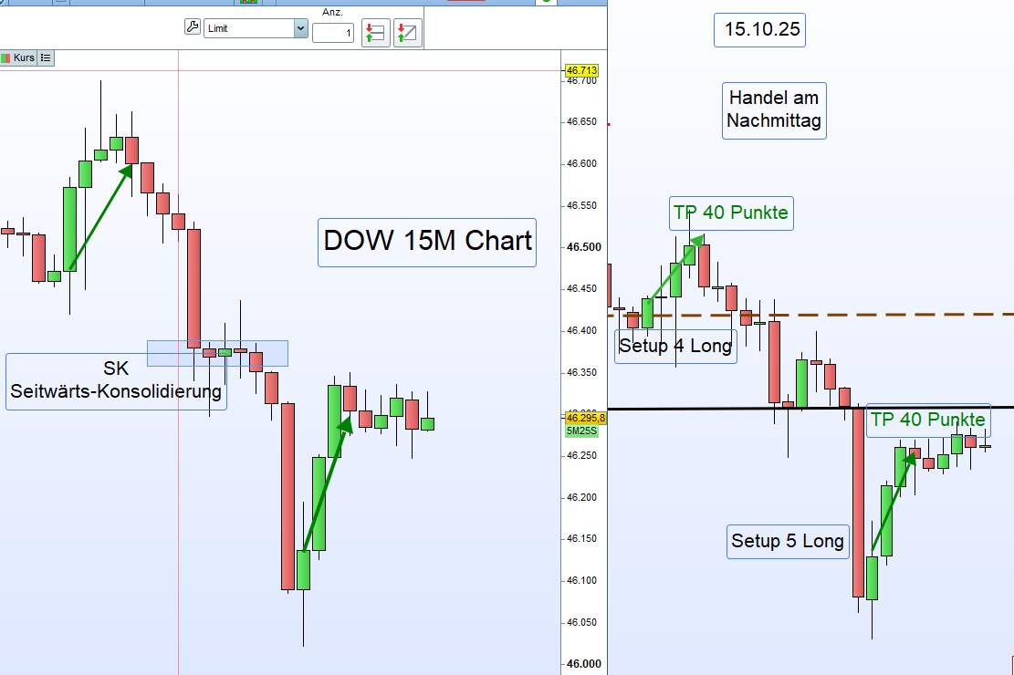 Der Einstieg Long mit Setup 4 war korrekt gewählt. Danach folgte jedoch eine deutliche Korrektur im Dow, die der DAX – wie so oft – nachvollzog. Erst mit dem Setup 5 Reversal konnte wieder eine erfolgreiche Long-Position eröffnet werden.