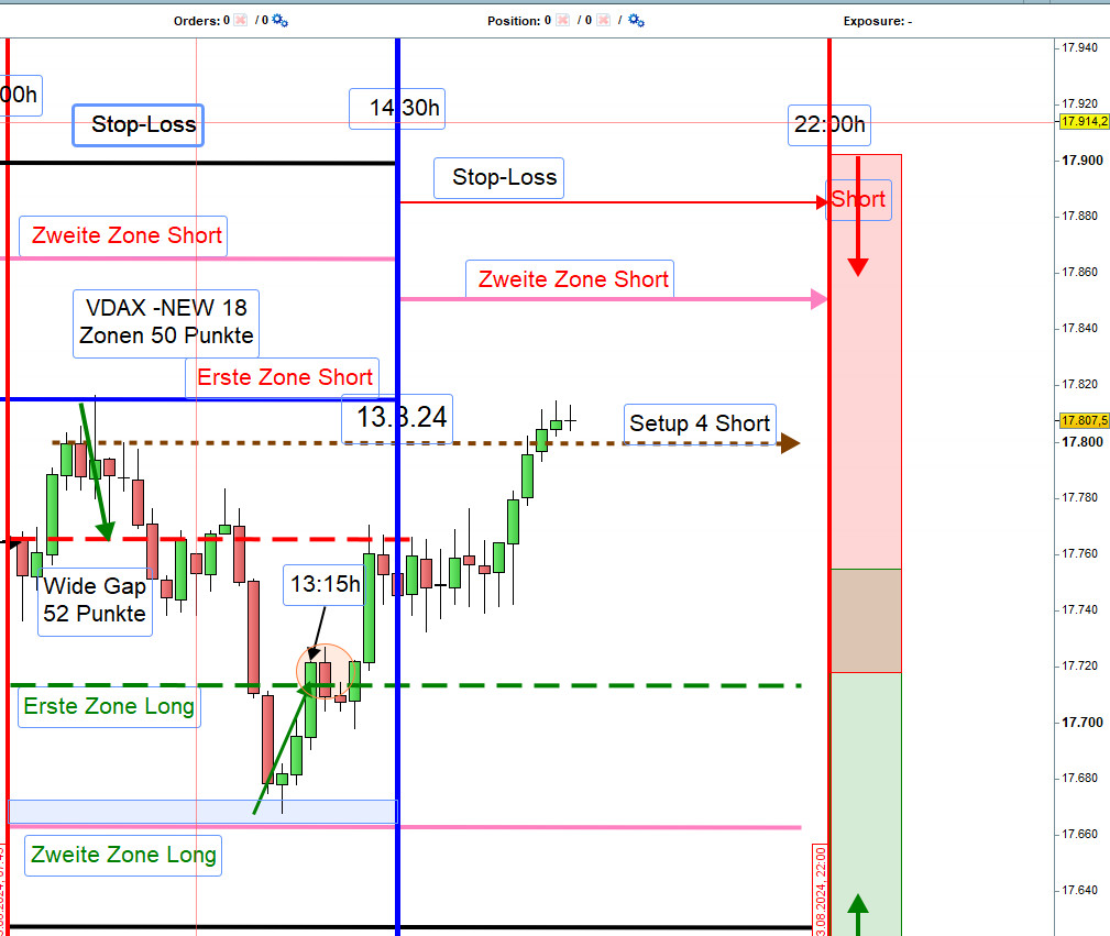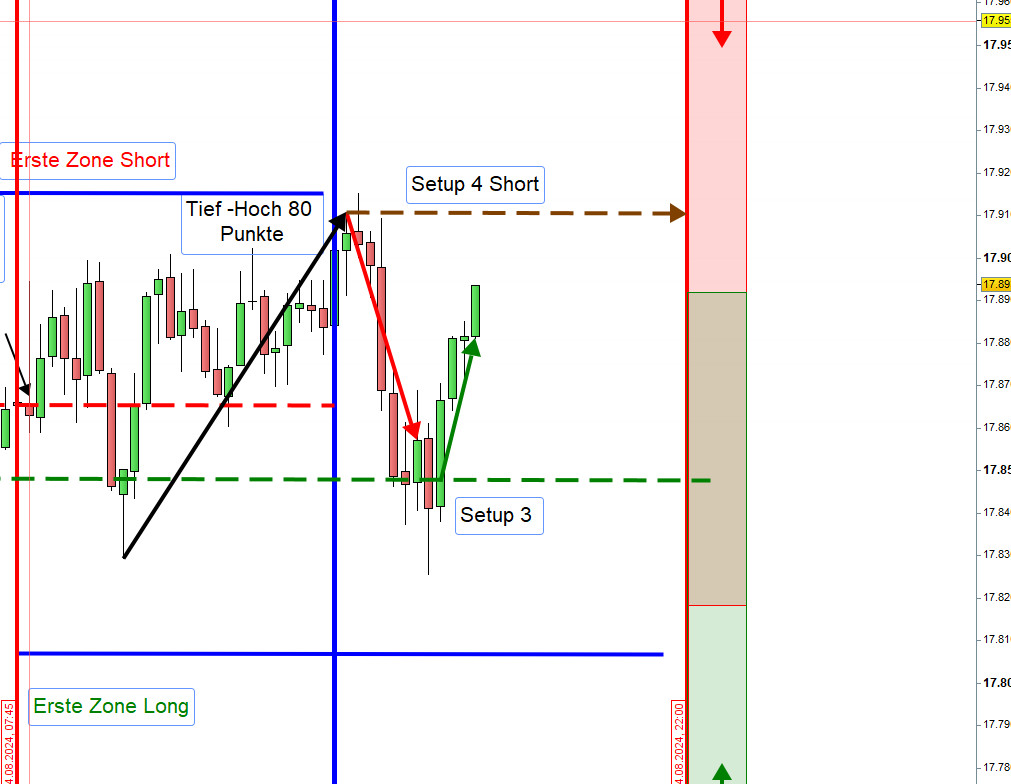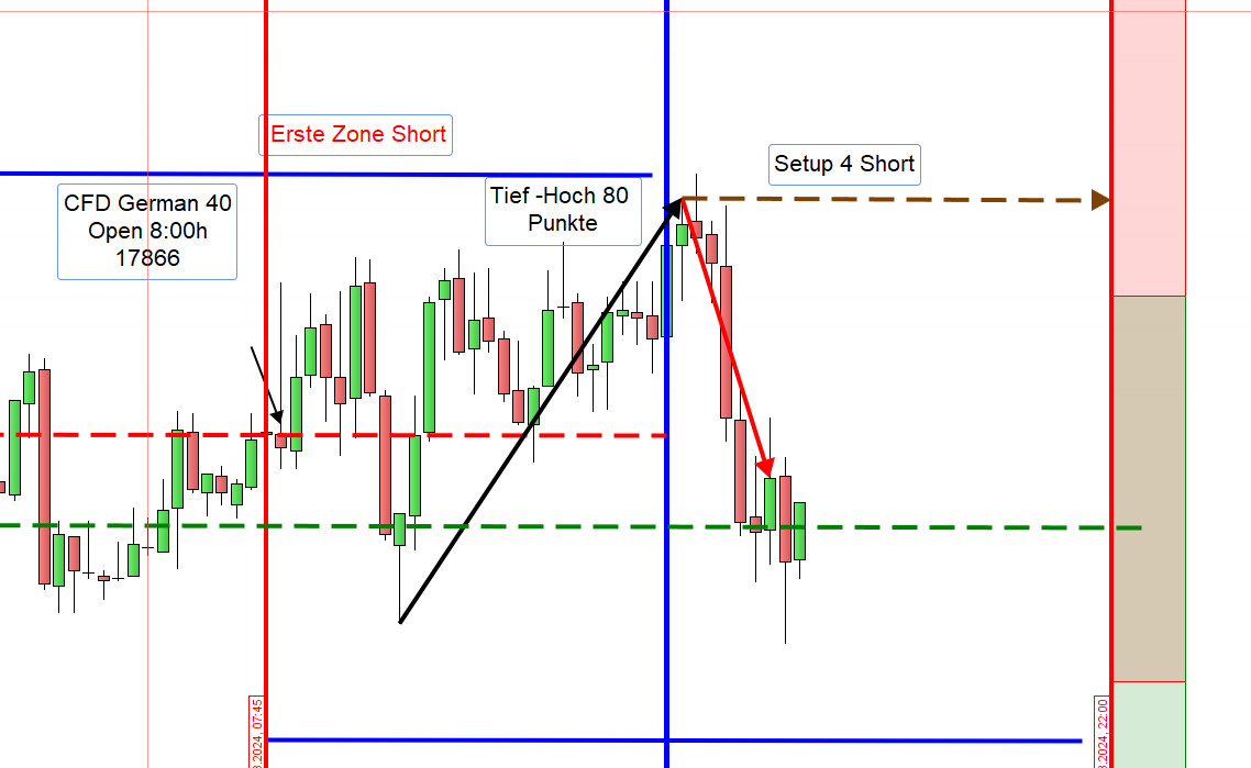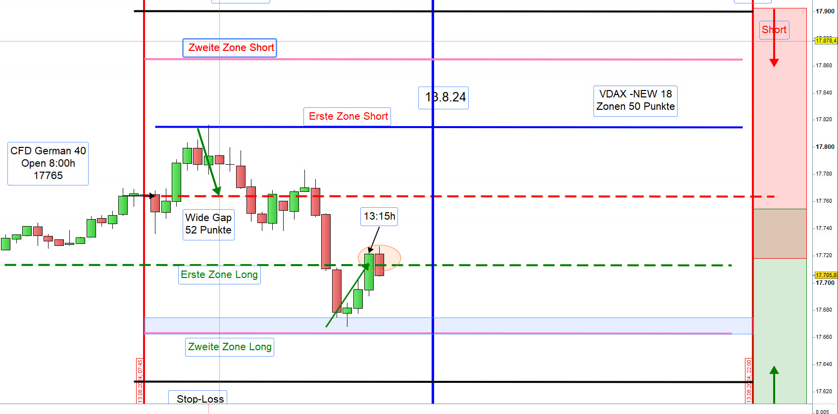 Die Eröffnung einer Position erfolgt gemäß dem Prinzip des Zonenhandels. Wurde die Position eröffnet, dann ist dies die erste Zone. Das Augenmerk liegt auf der Kursbewegung ab 9:00h, Eröffnung XETRA-Börse. Wird die Wide-Gap zügig durchgehandelt, dann erfolgt der Einstieg erst nach einer bullish oder bearish Umkehr-Kerze. Hammer und Inverted Hammer -