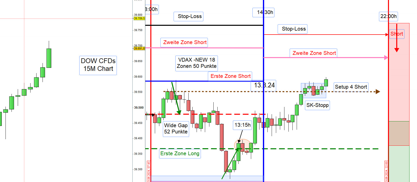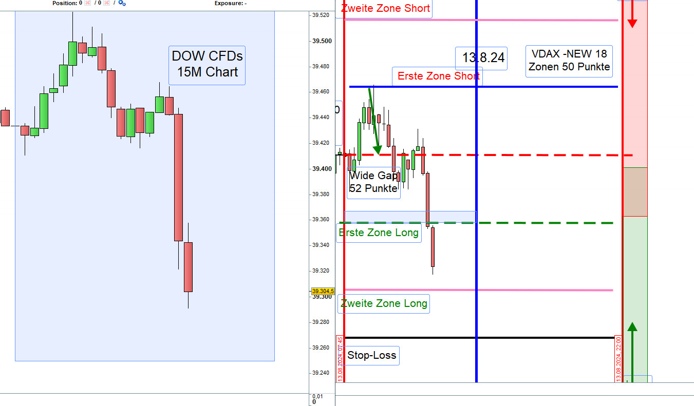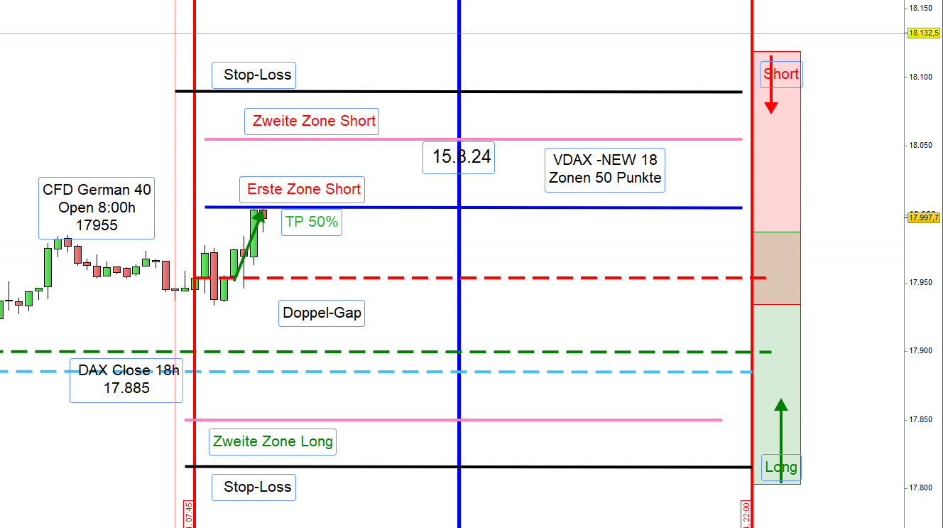 Die Eröffnung einer Position erfolgt gemäß dem Prinzip des Zonenhandels. Wurde die Position eröffnet, dann ist dies die erste Zone. Das Augenmerk liegt auf der Kursbewegung ab 9:00h, Eröffnung XETRA-Börse. Wird die Wide-Gap zügig durchgehandelt, dann erfolgt der Einstieg erst nach einer bullish oder bearish Umkehr-Kerze. Hammer und Inverted Hammer -
