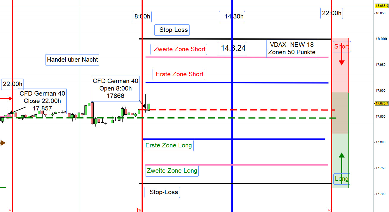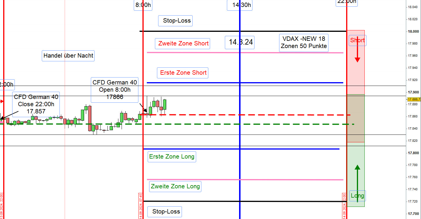 Gehandelt wird diese ab dem Vortagesschlusskurs, dann erste Aktionszone, mit dem Gewinnziel Eröffnungskurs um 8h. Es ist ein Revers Gap Close Handelsansatz.