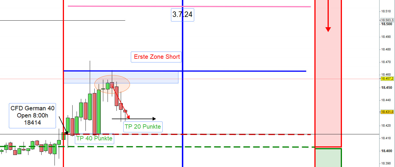 Wenn Kurs sofort wieder bis zur ersten Zone Short ansteigt, unten auch nicht unter dem Eröffnungskurs gehandelt wurde, Vorsicht!