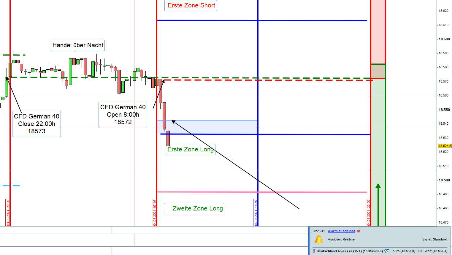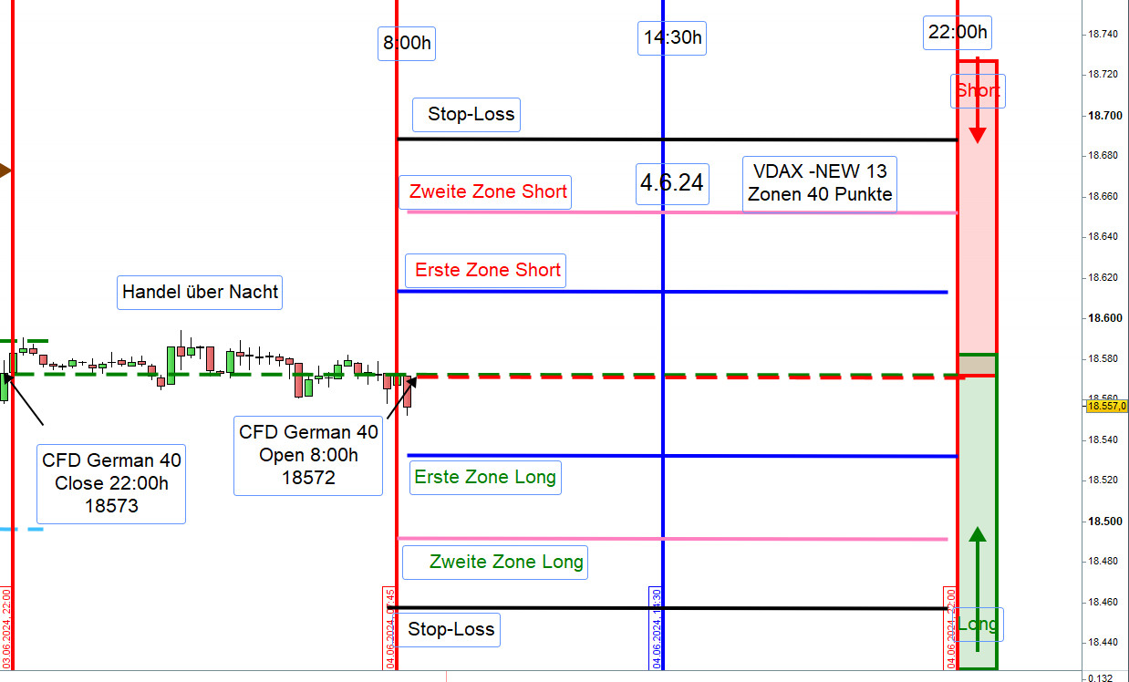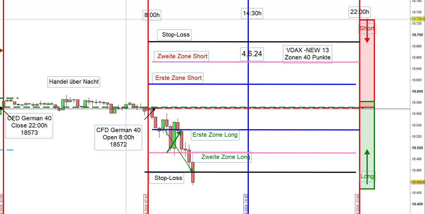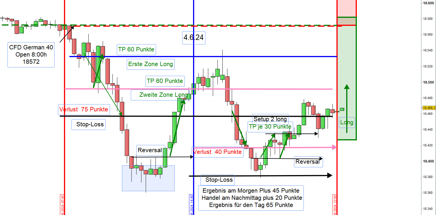 An der ersten und zweiten Zone Long wurde nur die Position aus der zweiten Zone mit Gewinn geschlossen. Die Position aus der ersten Zone war im Verlust und hätte ohne Verlust mit einem GS-Stopp glattgestellt werden können. Da dies nicht rechtzeitig geschah, wurde sie mit 75 Punkten Verlust ausgestoppt.