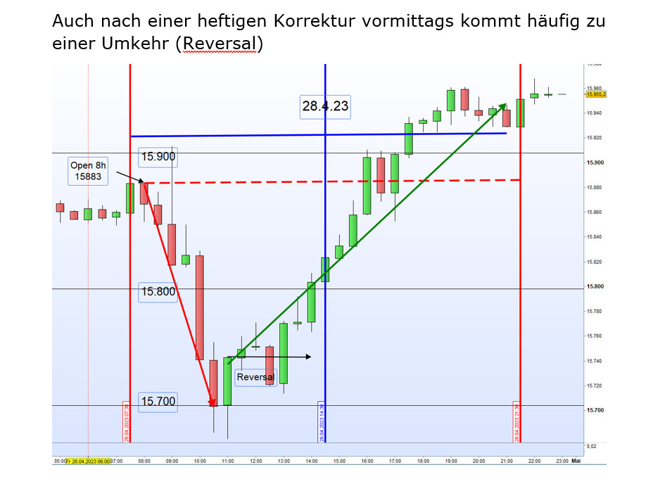 Weit unter dem Stopp-Loss kam es zu einer Konsolidierung mit anschließendem Reversal. Es konnte ein Gewinn von 60 Punkten erzielt werden.