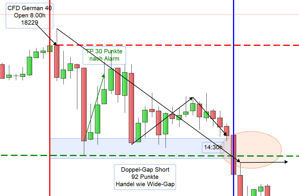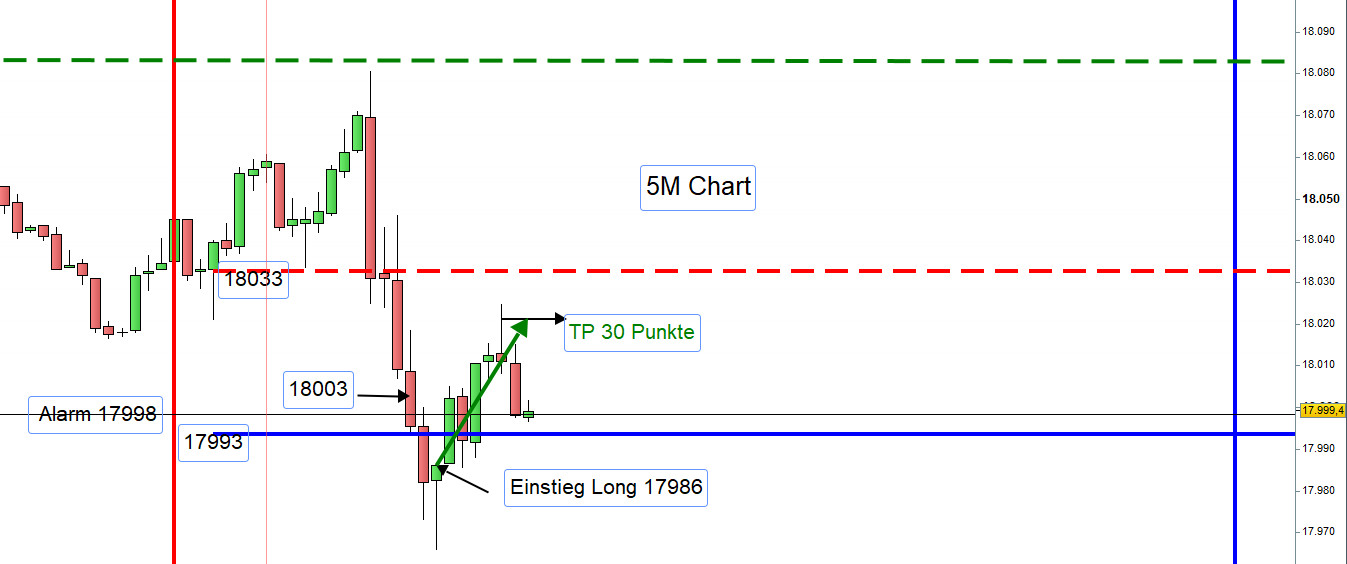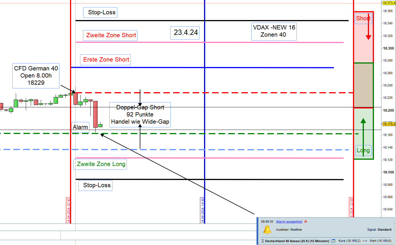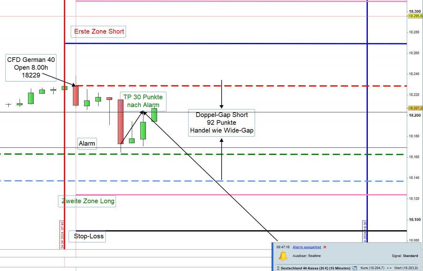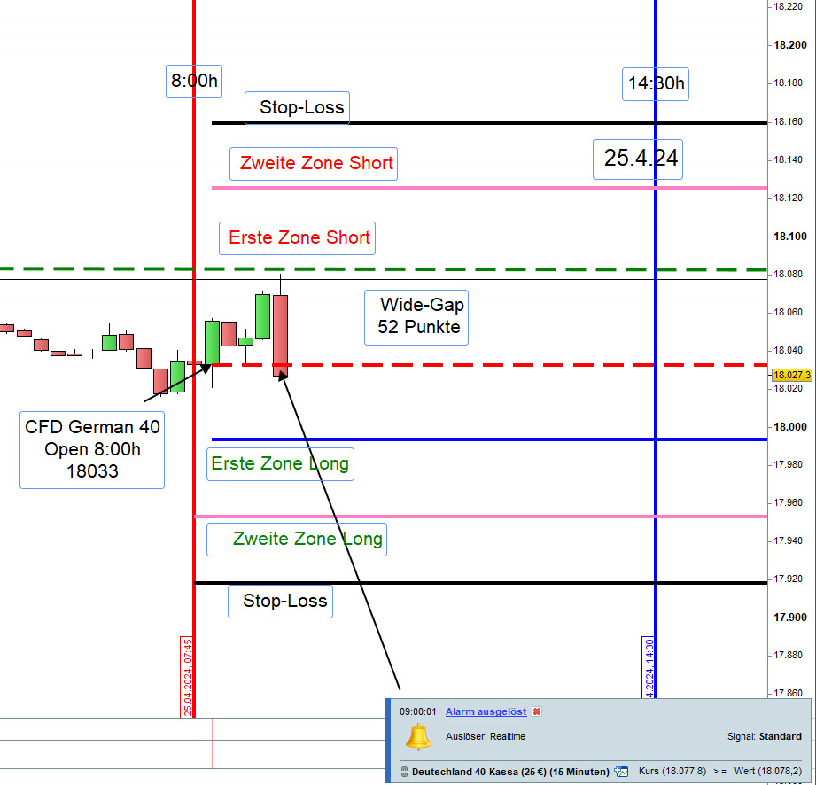 Damit ein Einstieg nicht zu früh erfolgt bzw. nicht ausgeführt wird können, insbesondere für Neueinsteiger, die Orderausführungen wie folgt erfolgen. Nach dem Eröffnungskurs um 8:00h werden die Zonen eingezeichnet und 5 Punkte vor den Zonen ein Alarm gesetzt.