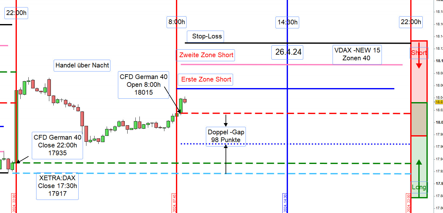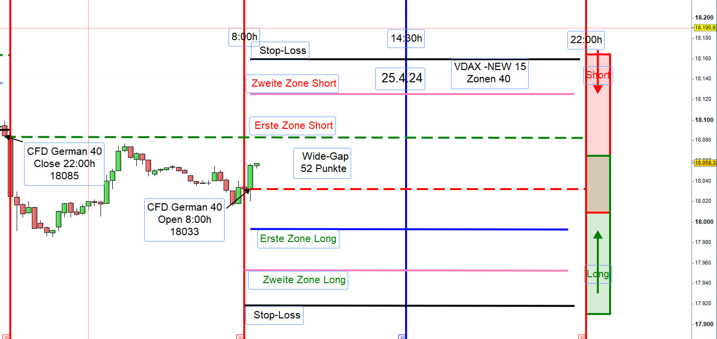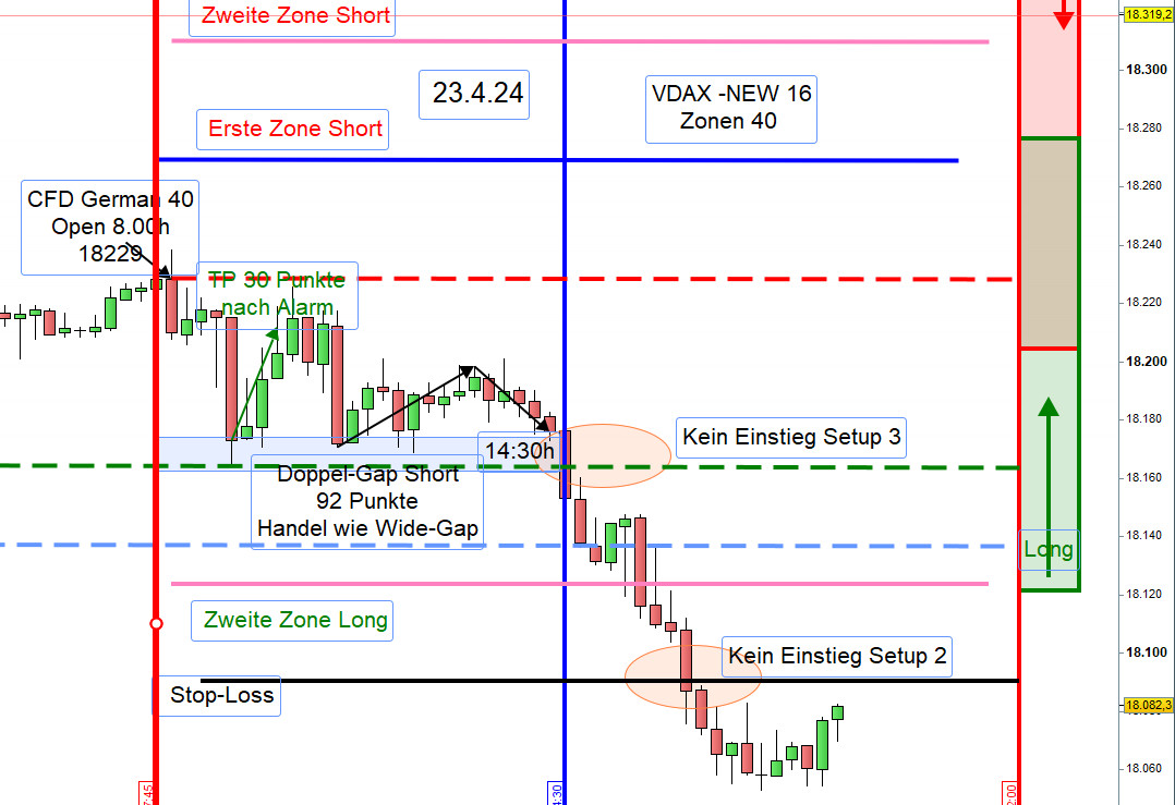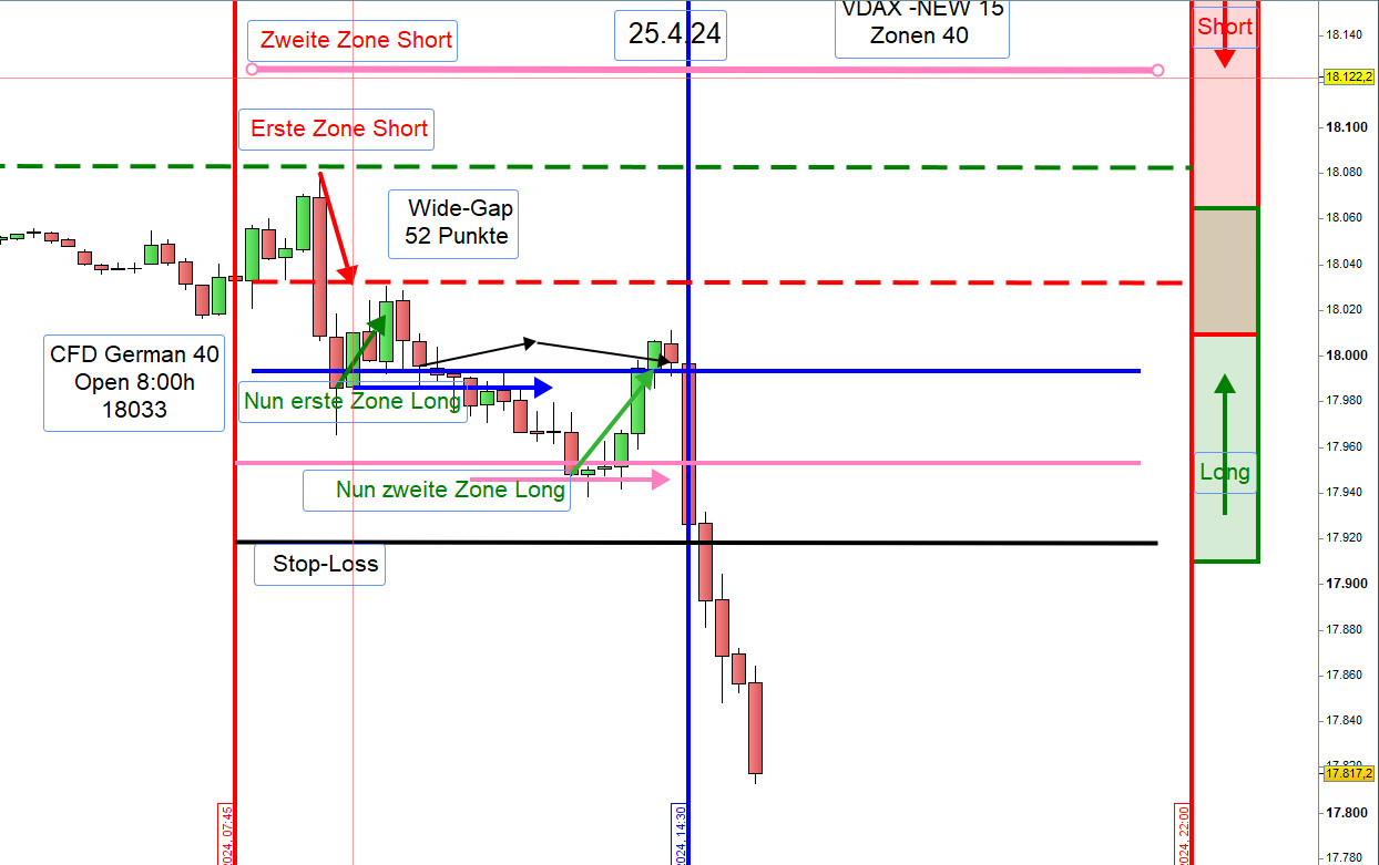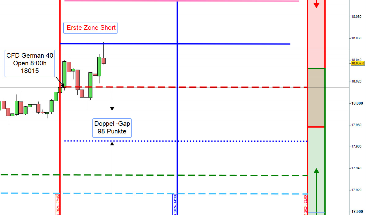 Damit ein Einstieg nicht zu früh erfolgt bzw. nicht ausgeführt wird können, insbesondere für Neueinsteiger, die Orderausführungen wie folgt erfolgen. Nach dem Eröffnungskurs um 8:00h werden die Zonen eingezeichnet und 5 Punkte vor den Zonen ein Alarm gesetzt.