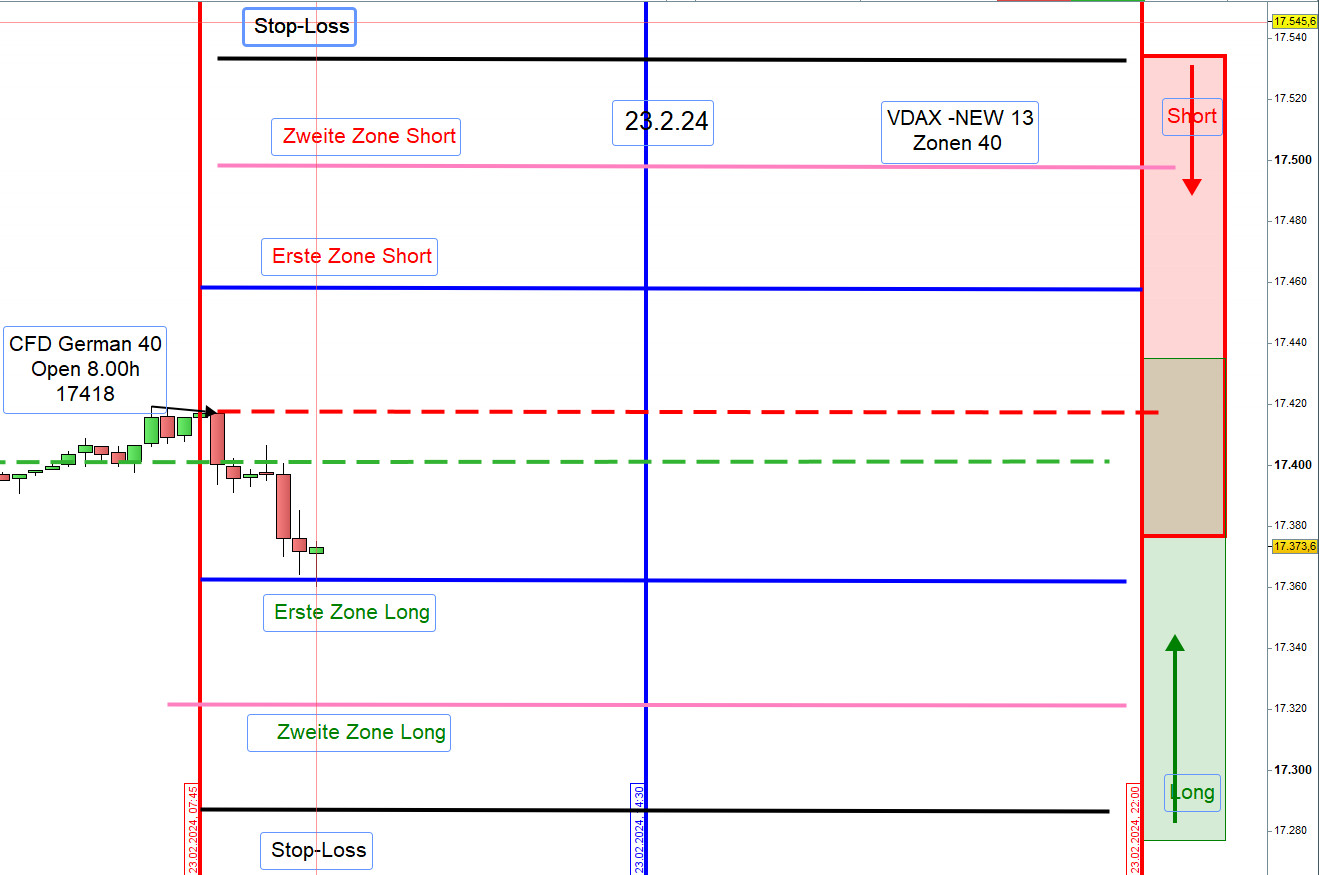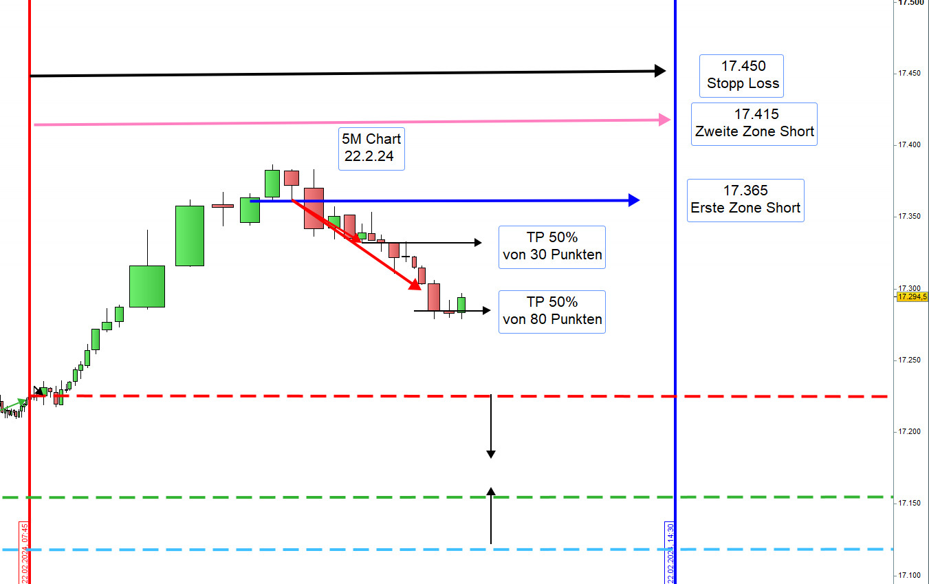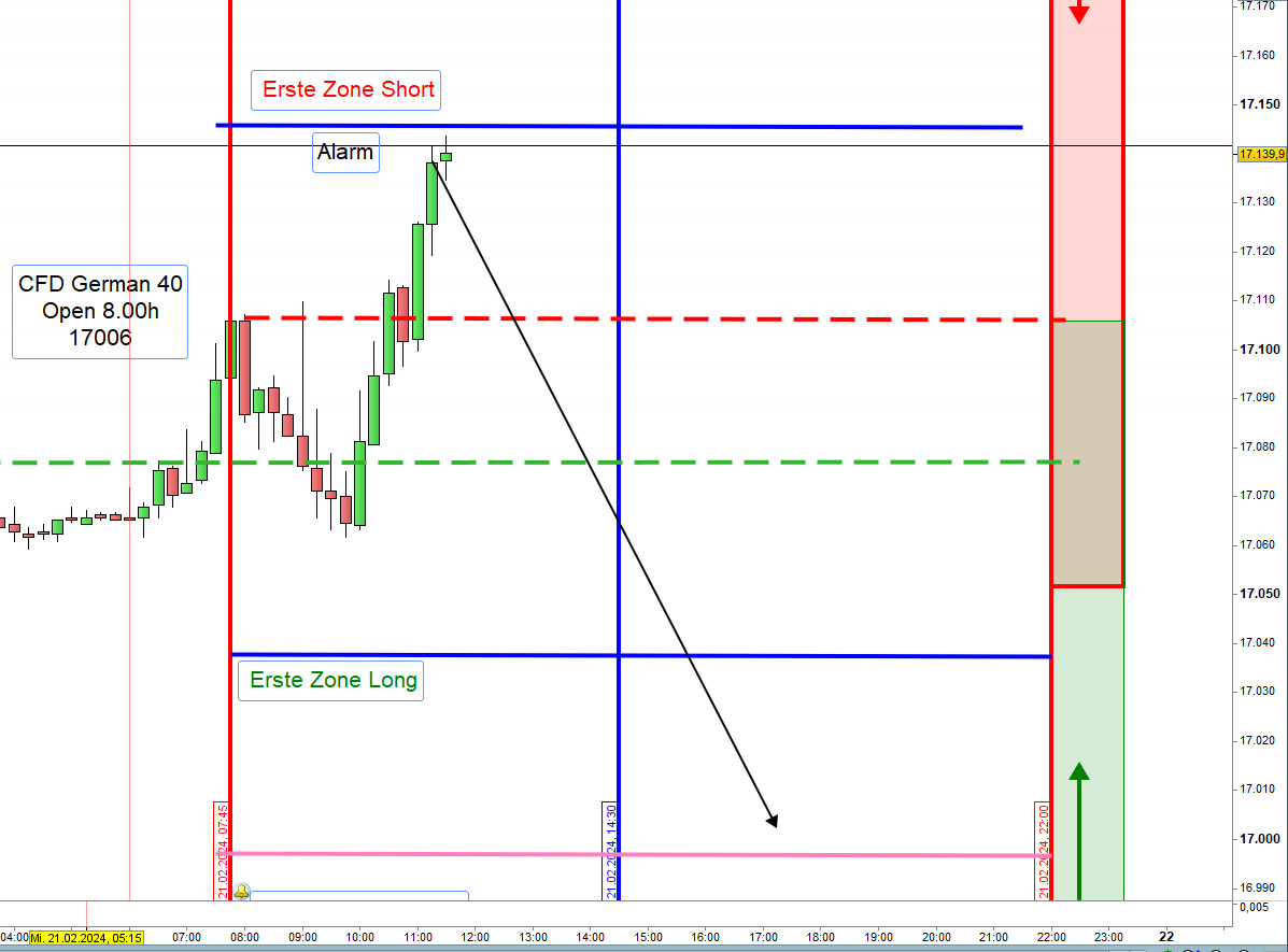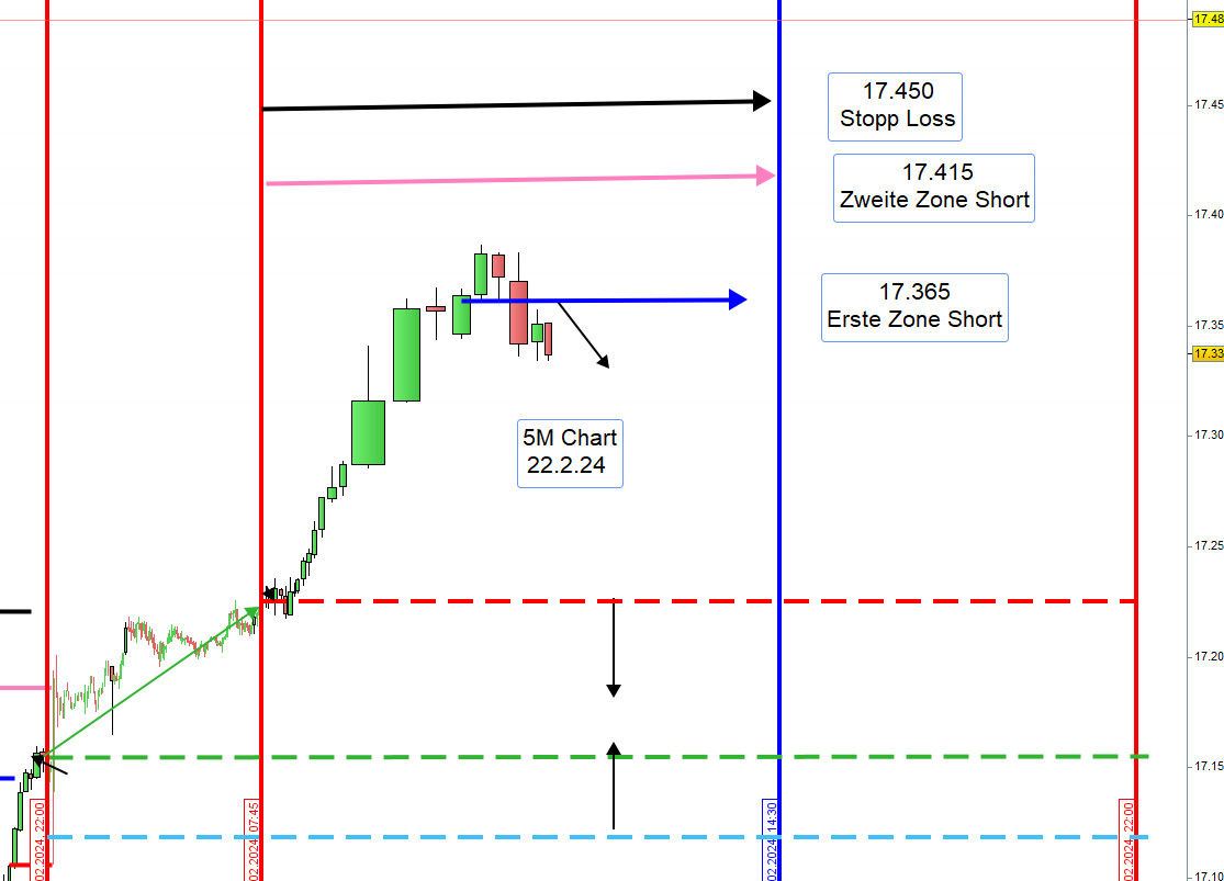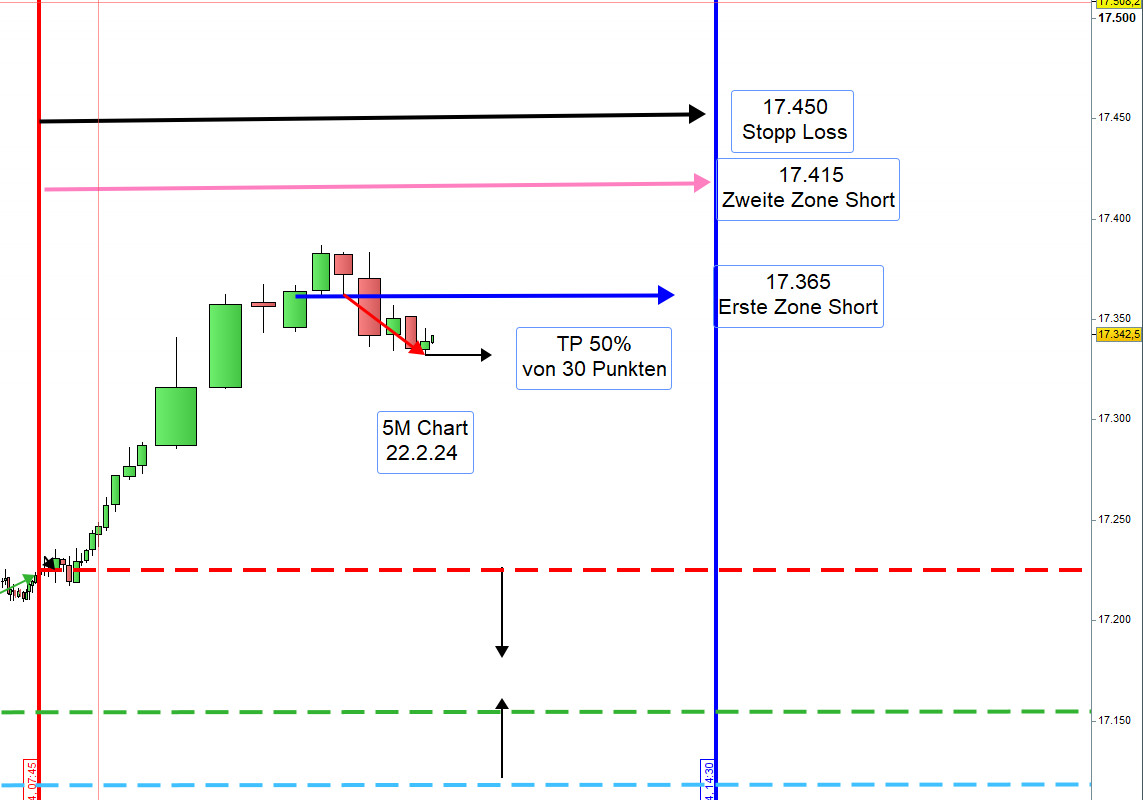 Vorschlag: Sofern der Kurs um 9:00h 20 Punkte über der Eröffnung von 17225 notiert, dann handeln wir Short und wenn darunter handeln wir Long. Bei Unsicherheit Enthaltung. Die Zonen werden dann angepasst.