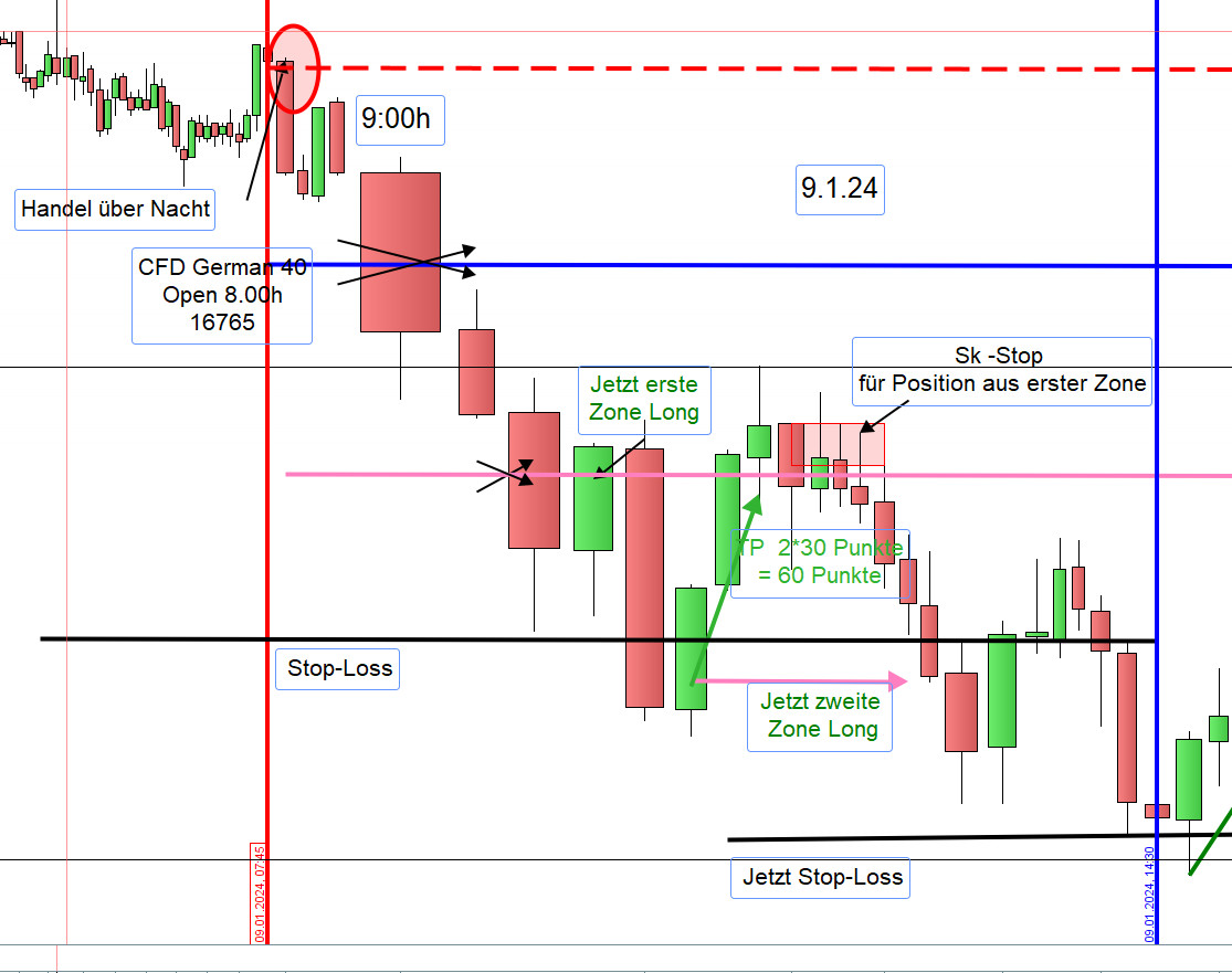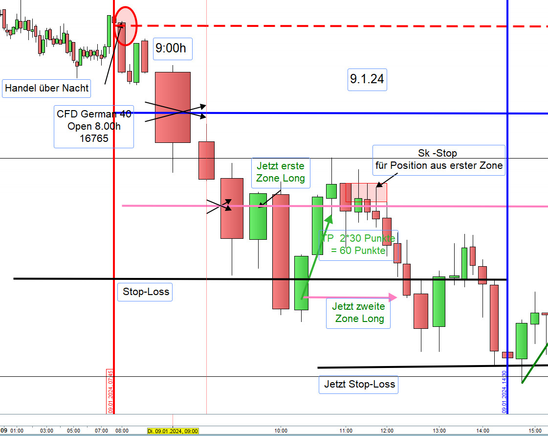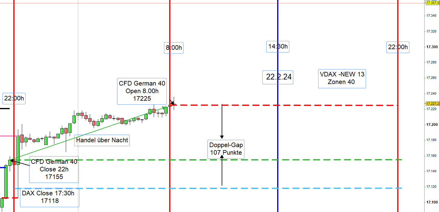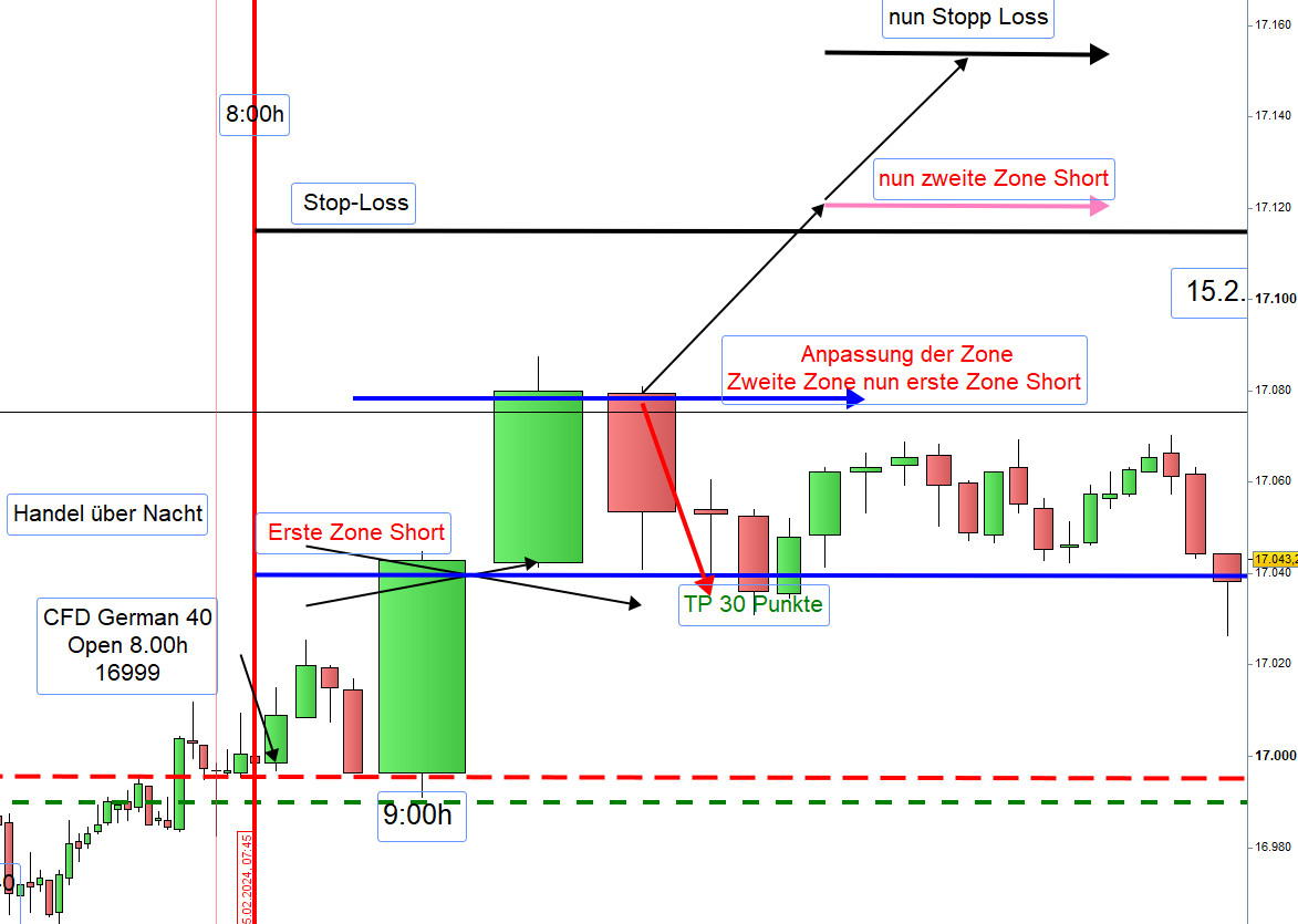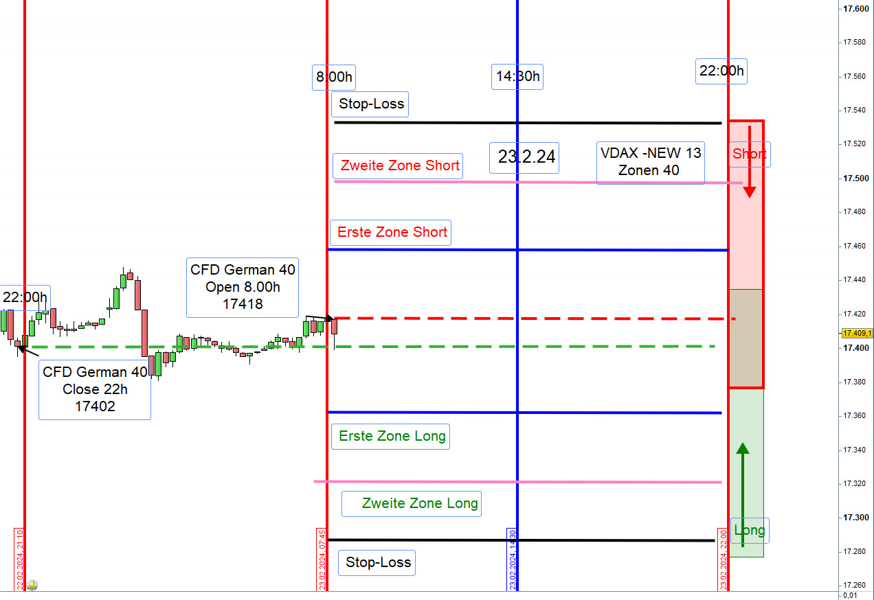 Vorschlag: Sofern der Kurs um 9:00h 20 Punkte über der Eröffnung von 17225 notiert, dann handeln wir Short und wenn darunter handeln wir Long. Bei Unsicherheit Enthaltung. Die Zonen werden dann angepasst.