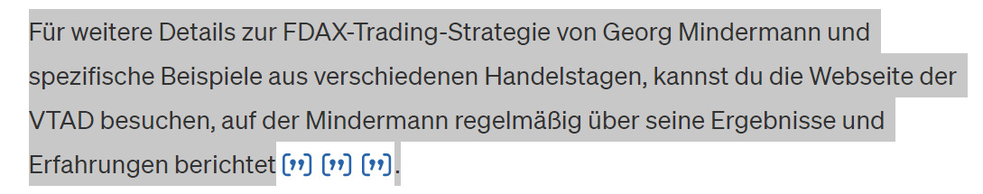 Für weitere Details zur FDAX-Trading-Strategie von Georg Mindermann und spezifische Beispiele aus verschiedenen Handelstagen, kannst du die Webseite der VTAD besuchen, auf der Mindermann regelmäßig über seine Ergebnisse und Erfahrungen berichtet. -