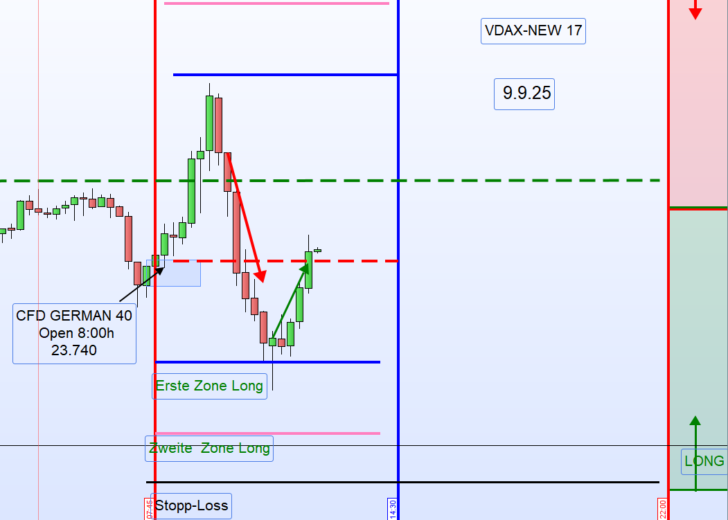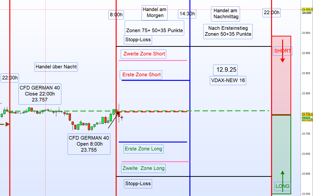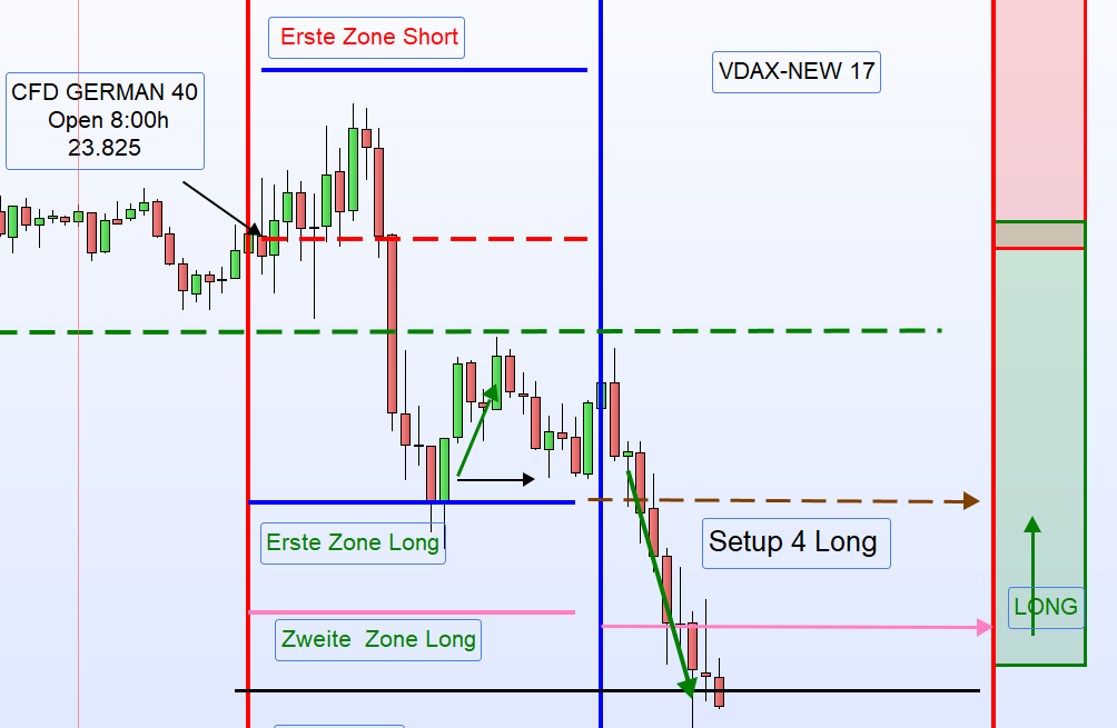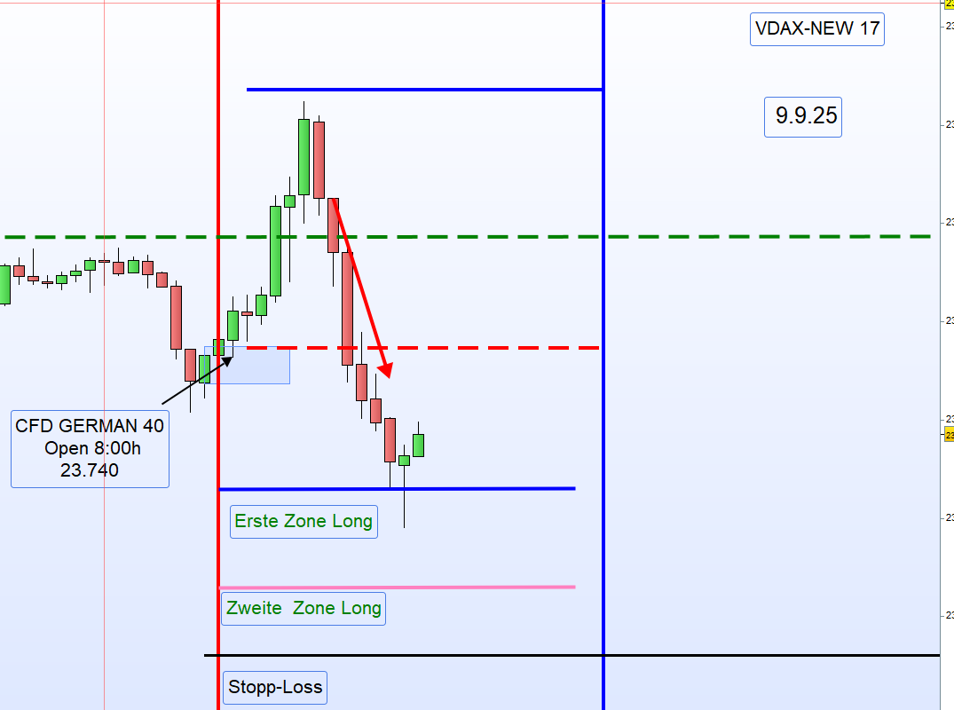 Heute hingegen eröffnete der Kurs um 8:00 Uhr 53 Punkte unter dem Vortagesschluss, wodurch die Range bis zur ersten Short-Zone auf 130 Punkte anwuchs.