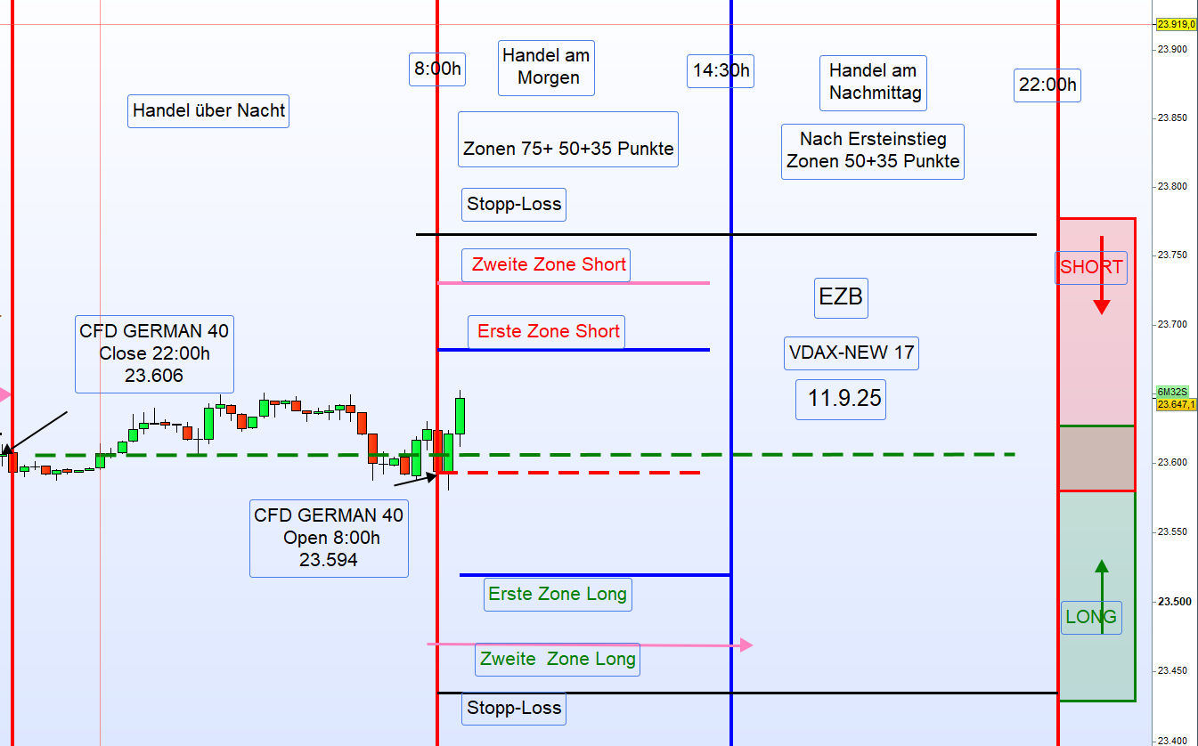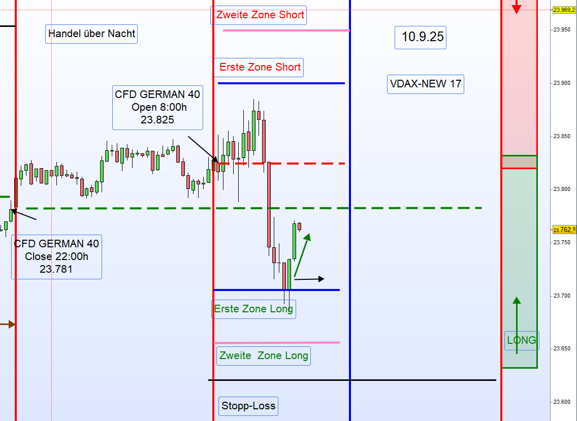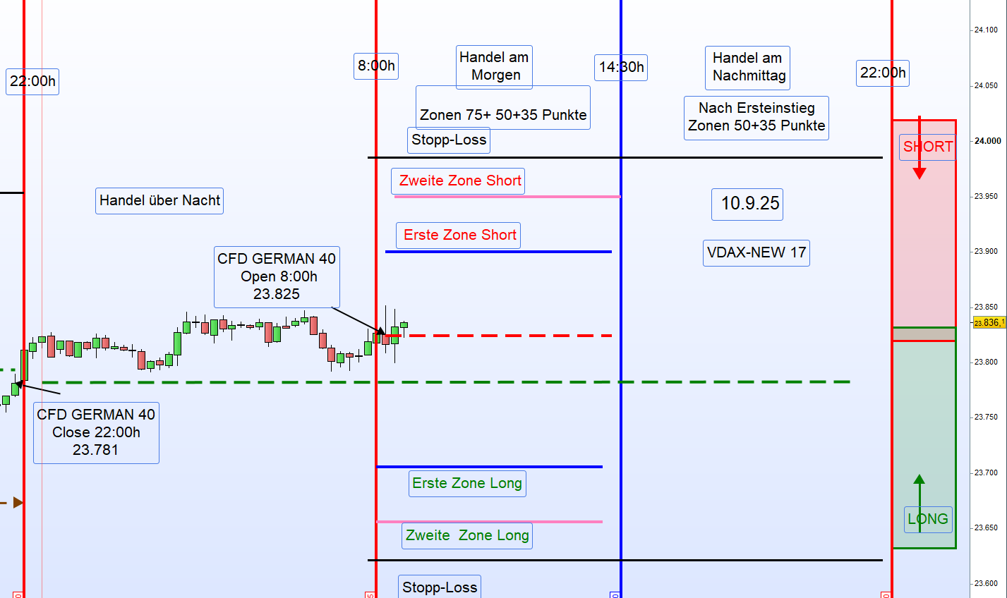 Heute hingegen eröffnete der Kurs um 8:00 Uhr 53 Punkte unter dem Vortagesschluss, wodurch die Range bis zur ersten Short-Zone auf 130 Punkte anwuchs.