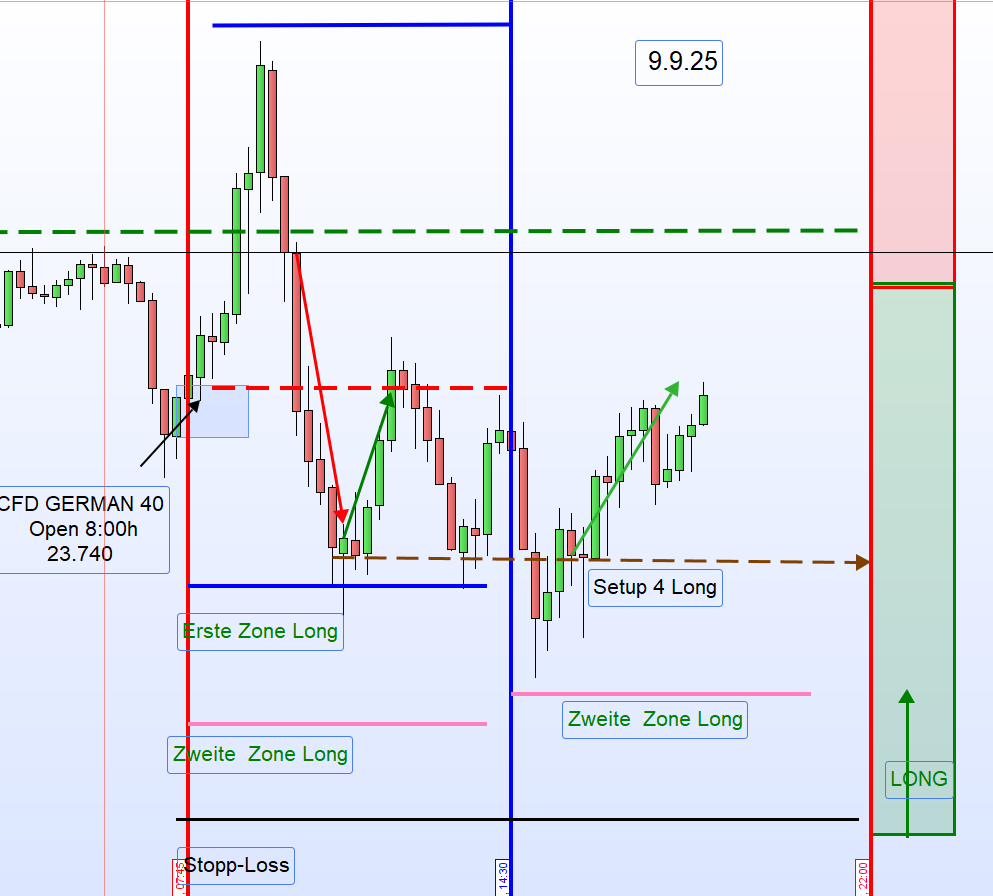 Der Handelstag zeigte, dass Regelwerk und gesunder Menschenverstand sich optimal ergänzen: Geduld bis zur Umkehrkerze, die Beachtung der erweiterten Range, die regelbasierte Long-Eröffnung und die Flexibilität in der Gewinnmitnahme führten zu einem sicheren Gewinn ohne unnötiges Risiko. -