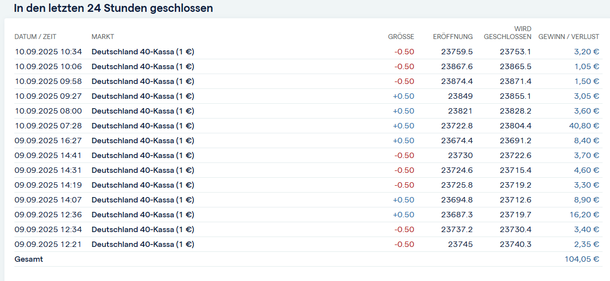 Vom Einstieg mit mehreren Kontrakten zum WachstumEin praktisches Beispiel macht es greifbar: Ein Trader startet mit 5.000 € Kapital und handelt den German 40 (DAX). Da ein CFD-Kontrakt etwa 1.200 € Margin erfordert, kann er verantwortungsvoll gleich mit zwei bis drei Kontrakten beginnen. Der Rest des Kapitals bleibt als Puffer für Schwankungen.