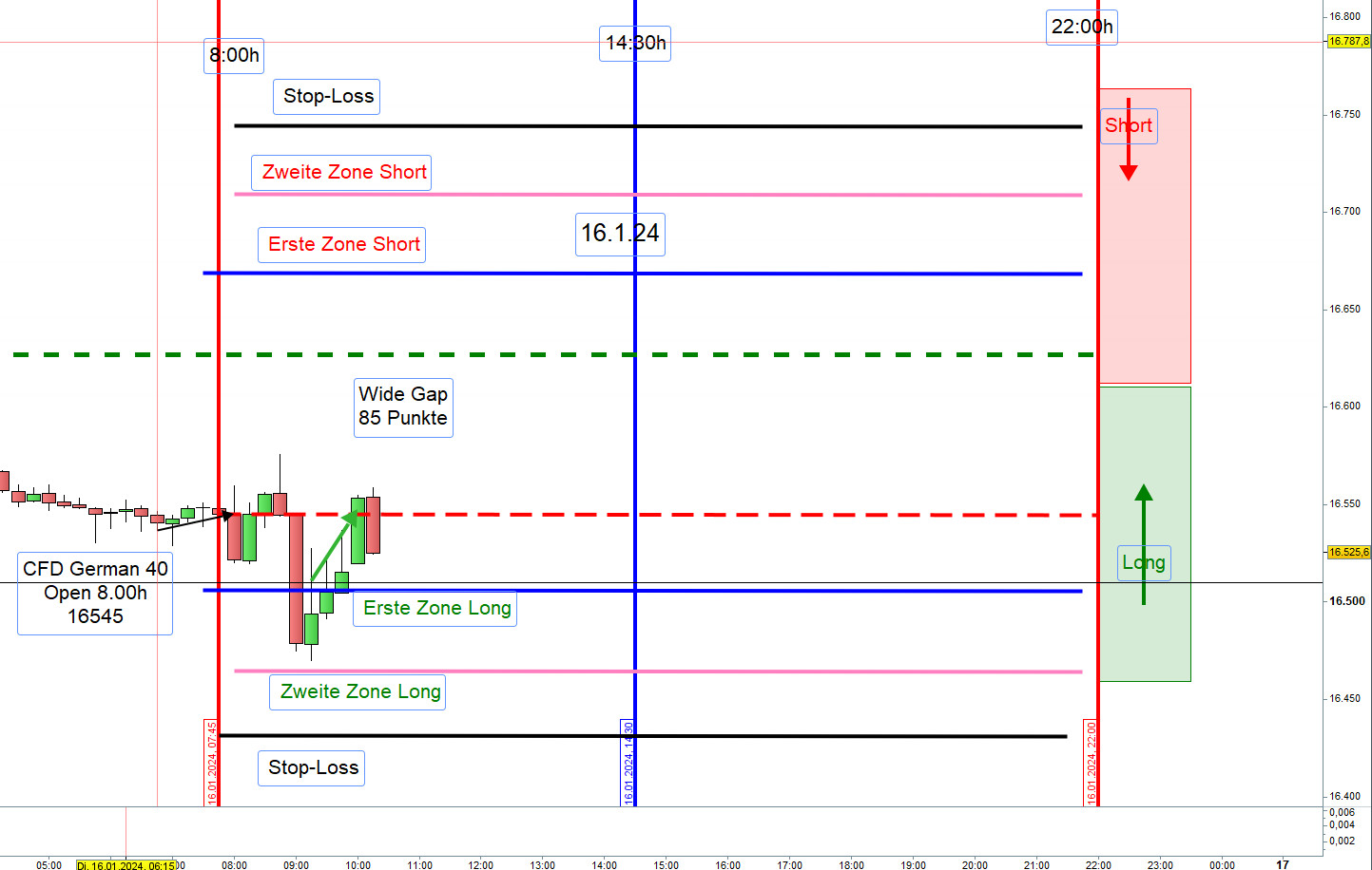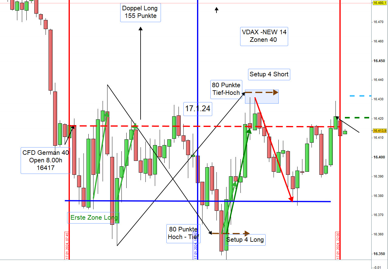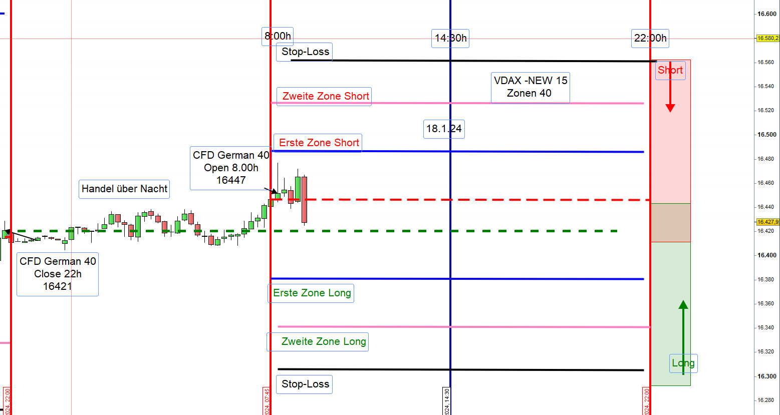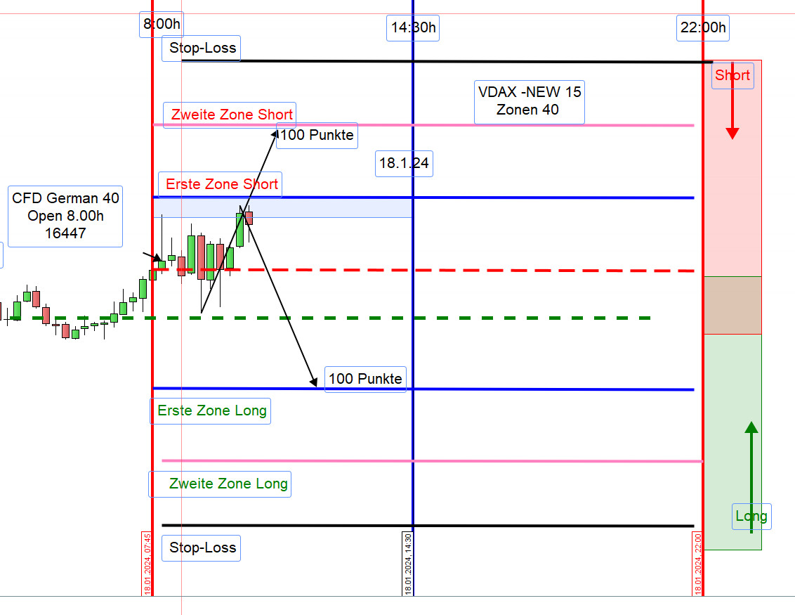 Es wird täglich ein Trading-Rahmen mit volatilitätsabhängigen Aktionszonen erstellt. Die Zonen basieren auf langjährigen Erfahrungswerten an denen sich innerhalb der Trading Range die meisten Korrekturen (Retracements) in Richtung Mittelkurs und darüber hinaus ausbilden. Diese dienen für die Eröffnung von Long oder Shortpositionen. Das Prinzip ist also, niedrig zu kaufen und hochzuverkaufen bzw. hochzuverkaufen um niedrig zu kaufen. Nach der ersten FDAX-Kursnotierung um 8:00h MEZ stehen 5 Schlüsseldaten zur Verfügung: 1. Schlusskurs XETRA-DAX um 17:35h Vortag (nach Auktion)2. Schlusskurs FDAX (Für CFDs German 40) um 22:00h Vortag.3. FDAX-Eröffnungskurs um 8:00h als Referenzkurs für den Handelstag 4. Kurs VDAX-NEW zur Bestimmung der zu erwartenden Intraday Handelsspanne