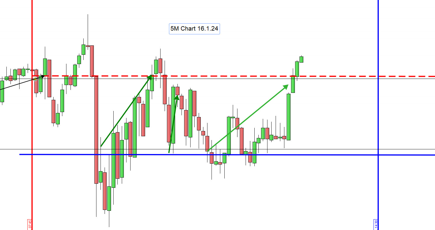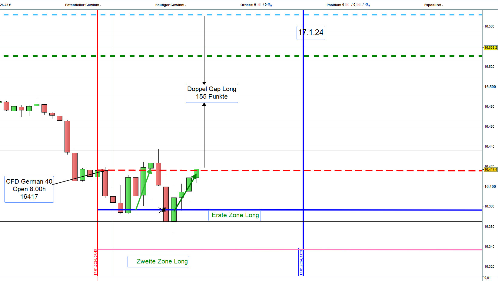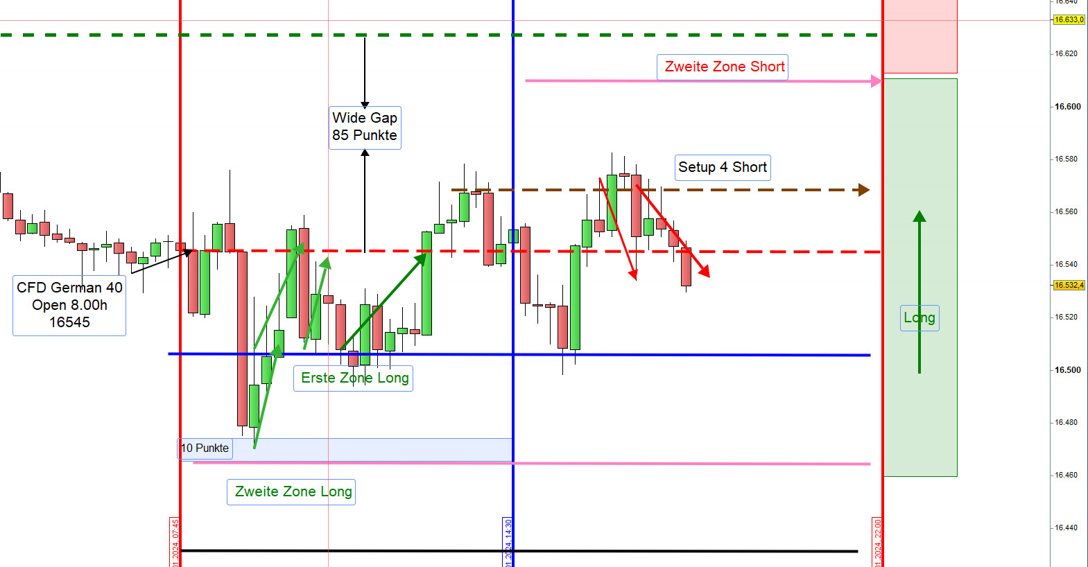 Zum einen sollte beachtet werden, dass kein Schlusskurs nachhaltig unter dem Eröffnungskurs lag, daher Vorsicht mit short. Die erste Zone short konnte mit 20 Punkten tp realisiert werden. An der zweiten Zone war Vorsicht geboten, da der Dax nur grüne Kerzen stellte. Zweite Zone short wurde auch nicht ausgeführt.