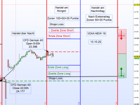 Guten Morgender DAX eröffnete heute mit einer weiten Gap von 219 Punkten.Wir passen den Handel entsprechend an – ähnlich einem Doppel-Gap-Szenario. Handelsplan für heute:Zonenhandel ab EröffnungskursErste Aktionszone: ±100 Punkte (long & short)Zweite Aktionszone: ±50 Punkte beidseitigStop-Loss: 35 Punkte auf beiden SeitenZiel ist es, die Bewegung innerhalb dieser erweiterten Aktionszonen strukturiert zu handeln, wobei die erste Zone die Hauptorientierung vorgibt.Mal sehen, ob der Markt heute die Lücke technisch schließt oder ob wir eine Fortsetzung der Bewegung bekommen.Allen einen erfolgreichen Handelstag! -