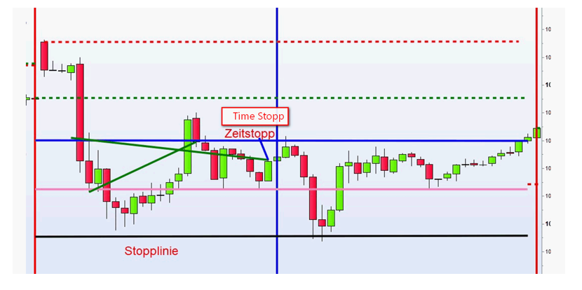 Wurden vormittags Positionen eröffnet und notieren diese kurz vor 14.30h noch im Verlust, dann erfolgt ein Zeitstopp und die Positionen werden glattgestellt. Gewöhnlich sind es Positionen aus der ersten Zone, wenn die Position aus der zweiten Zone mit Erfolg geschlossen wurde und sich diese um 14:30h noch im Verlust befindet.