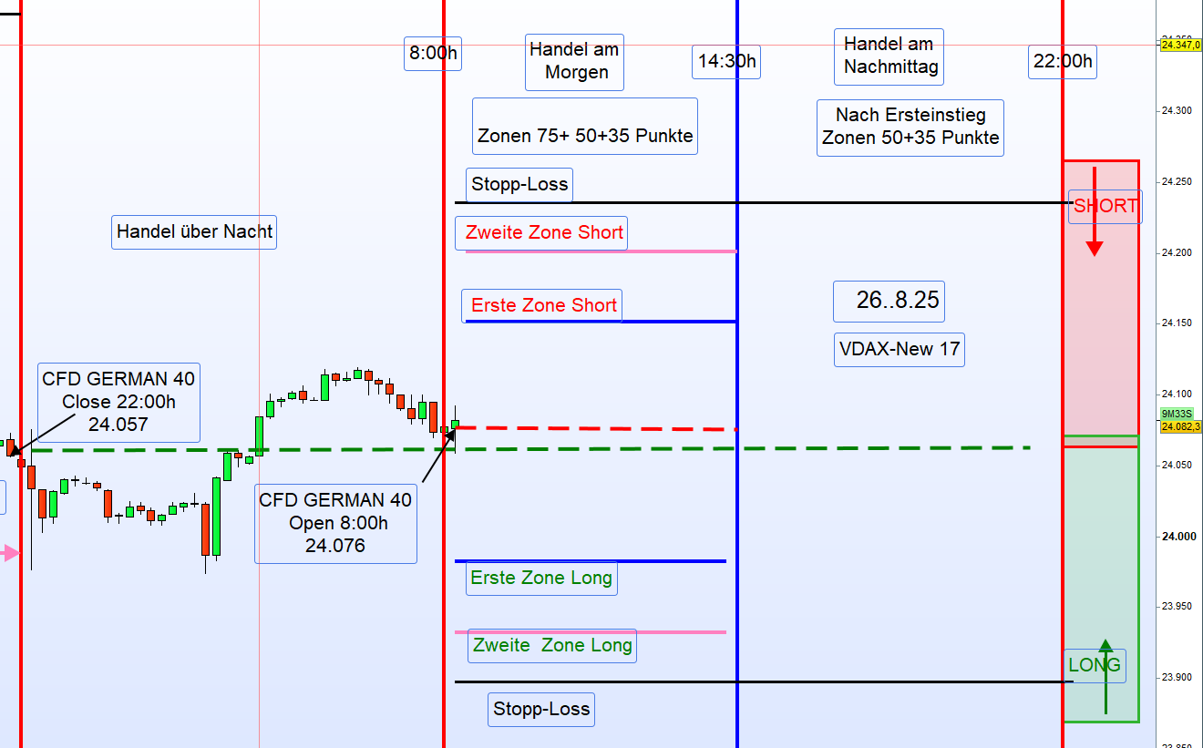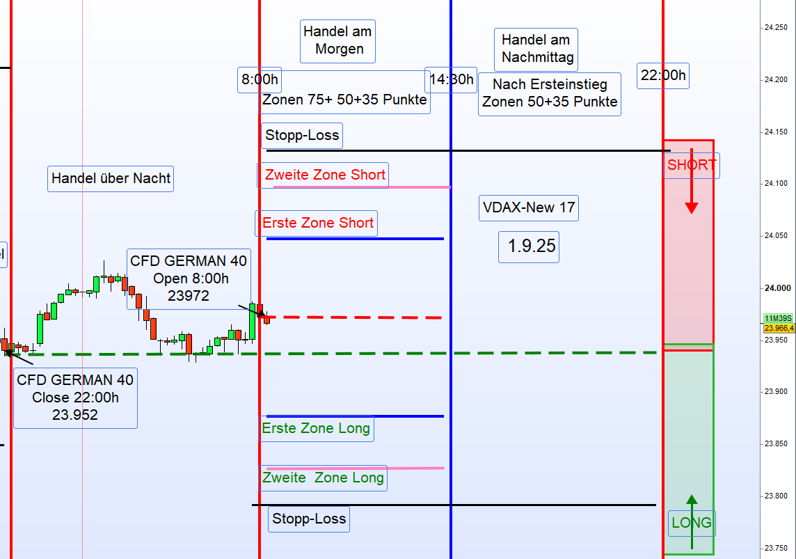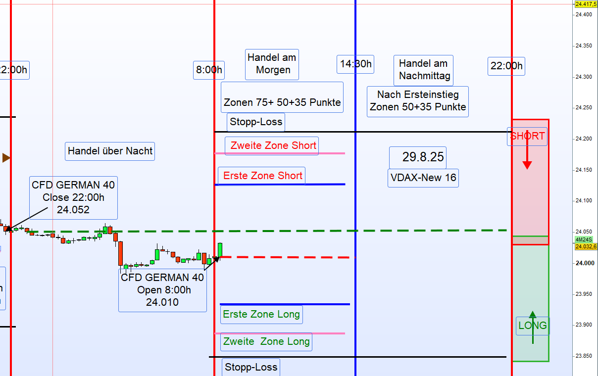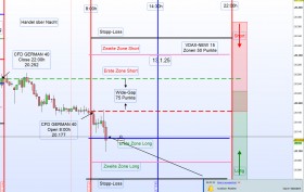 Der DAX-Zonenhandel wird flexibel gesteuert anhand des aktuellen DAX-Standes, der VDAX-NEW-Notierung sowie möglicher Gaps zwischen Schlusskurs (22:00 Uhr) und Eröffnungskurs (8:00 Uhr).