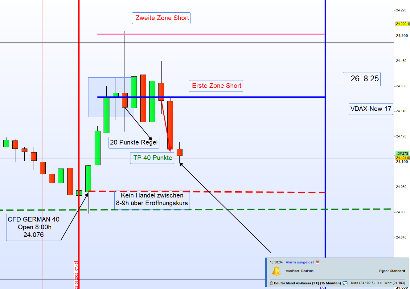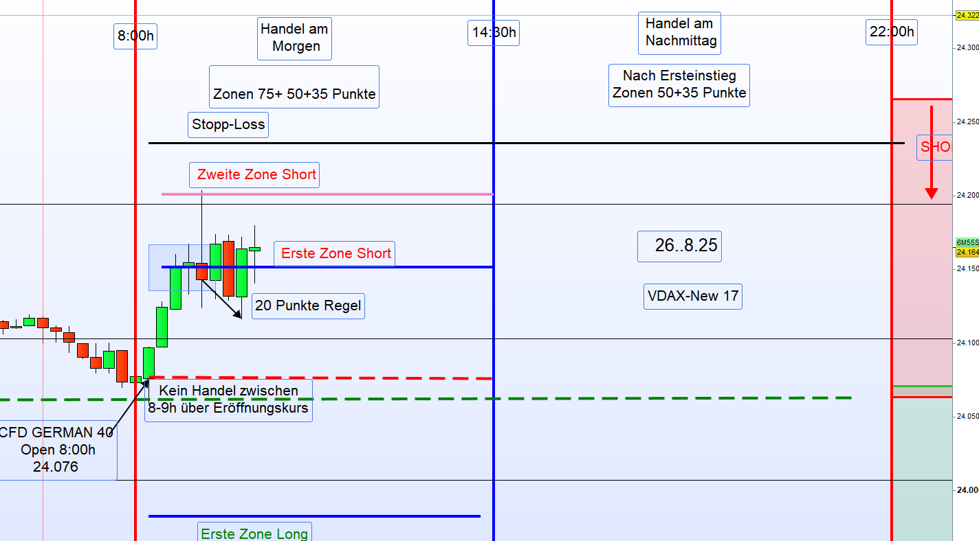 Die Einteilung erfolgt in Aktionszonen entsprechend der Volatilität, Notierung VDAX-NEW. Notiert der VDAX-NEW über 30, dann werden vor 9:00 Uhr, Eröffnung XETRA-DAX, keine Positionen eröffnet.