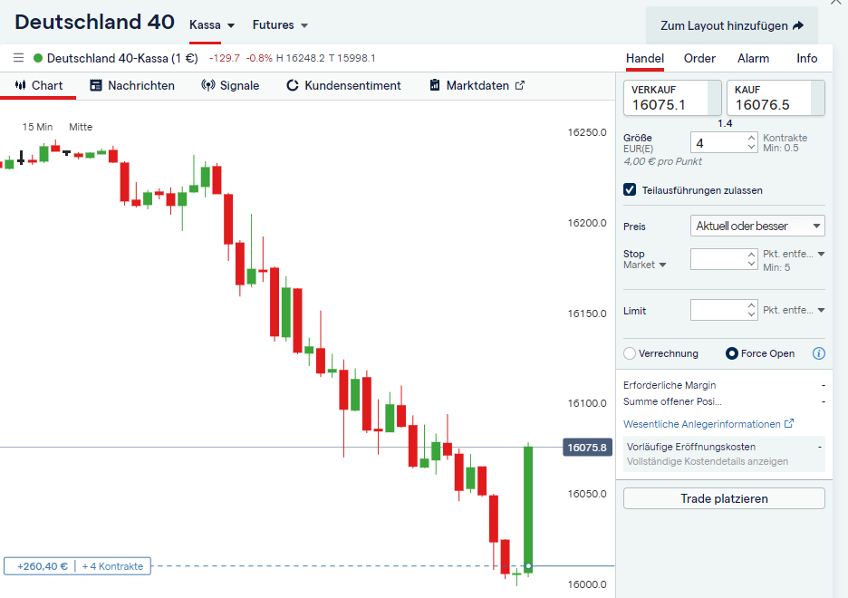 Einstieg mit 4 Long um 15:30h US Börseneröffnung. Nach Gewinn von 260€ mit 4 CFDs Long wurden davon 2 verkauft. Es blieben also noch 2CFDs im Rennen. Davon wurde nun auch 1 CFD verkauft.