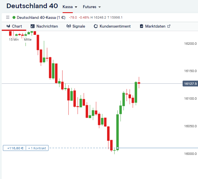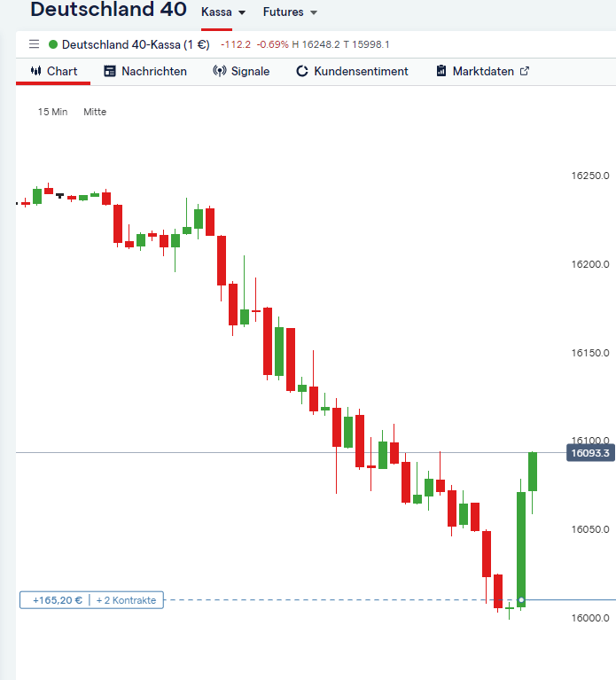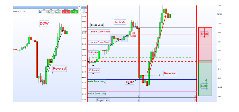 Zunächst muss der Reversal am Tagestief der CFDs von DAX und DOW dokumentiert werden.