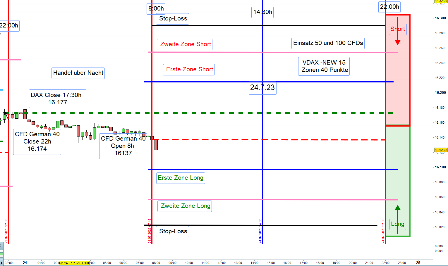 Die Linien der Aktionszonen dienen zur Orientierung. Viele Kurse durchschneiden mit Momentum die Linien. Andererseits kommt es zu einer punktgenauen Berührung der Zonen mit sofortigem Rücksetzer zum Mean. Außerdem gibt es „near misses“ von 1-3 Punkten. Damit ein Einstieg nicht zu früh erfolgt bzw. nicht ausgeführt können, insbesondere für Neueinsteiger, die Orderausführungen wie folgt erfolgen. Nach dem Eröffnungskurs um 8:00h werden die Zonen eingezeichnet und 5 Punkte vor den Zonen ein Alarm gesetzt.