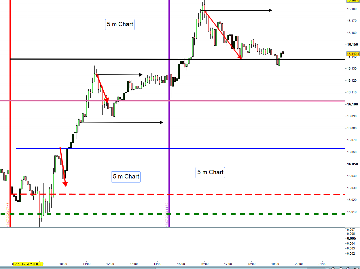 2.Am Nachmittag erfolgte der Einstieg Short an der Stop- Loss Linie mit Setup 2 Short bei 16.137. Diese Position lief bis zur zweiten Zone in den Verlust. Der dort dann erfolgte Einstieg Short mit doppeltem Einsatz hat sein TP mit 30 Punkten erfüllt. Die dann noch offene Position aus der ersten Zone wurde auch mit dem GS Stopp mit kleinem Verlust geschlossen.