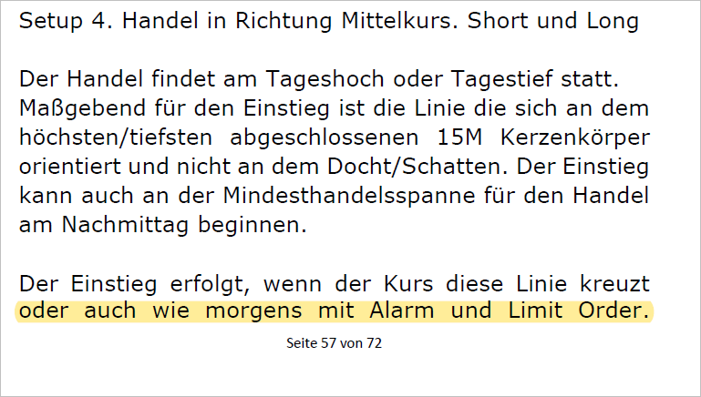 Der Einstieg erfolgt wenn der Kurs diese Linie kreuzt oder auch wie morgens mit Alarm und Limit Order.