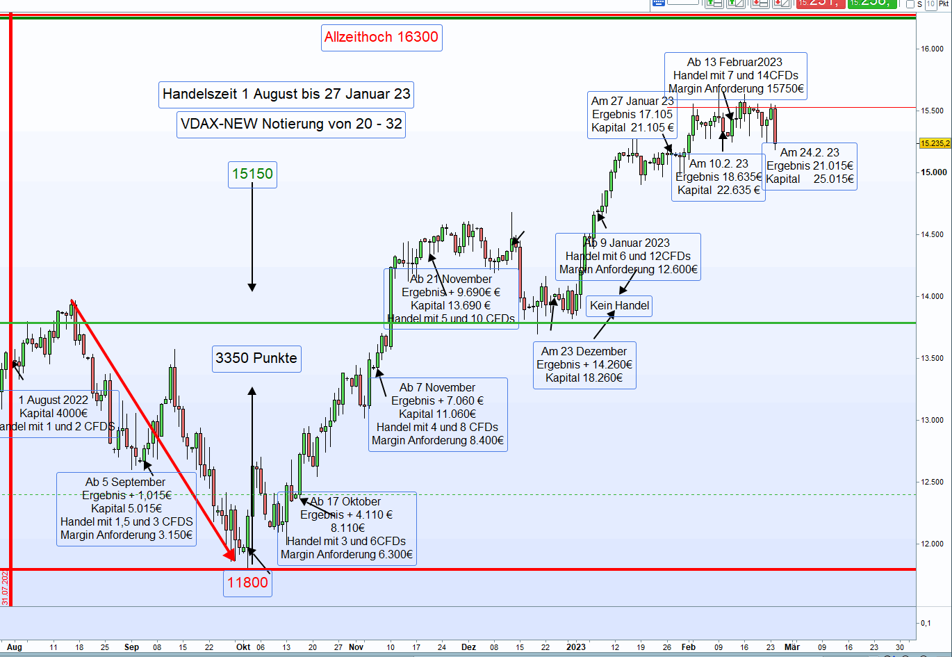 - Wurden an der ersten und zweiten Zone, Short oder Long, Positionen eröffnet und nur die Positionen aus der zweiten Zone mit Gewinn glattgestellt, dann wird nach einem Retracement (Rückkehrbewegung) bis zur zweiten Zone dort nur dann eine neue Position eröffnet, wenn der VDAX-NEW unter 20 notiert"