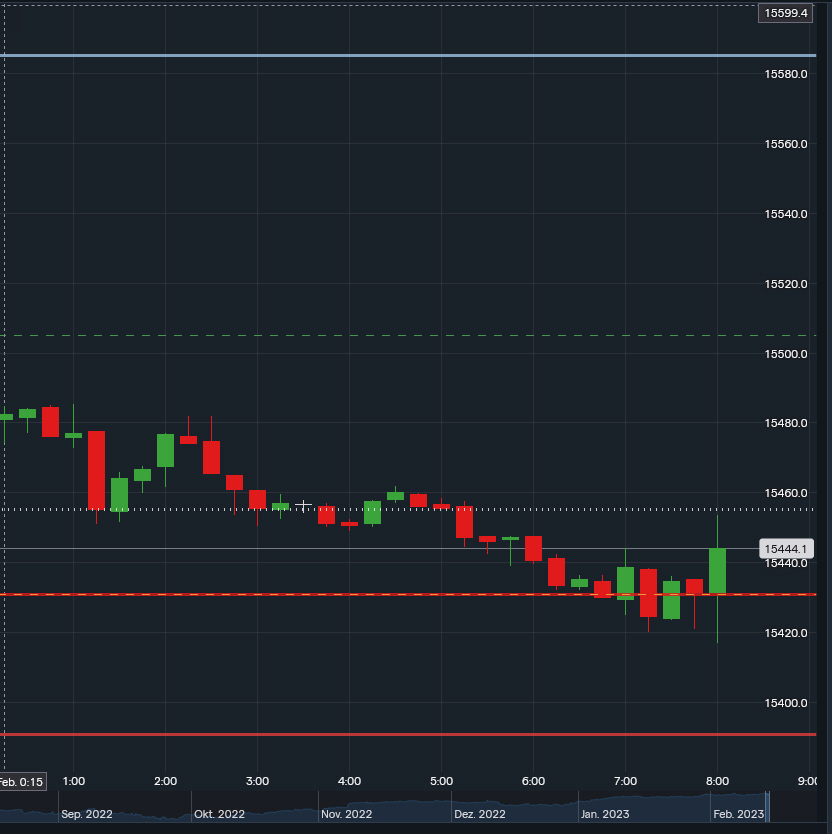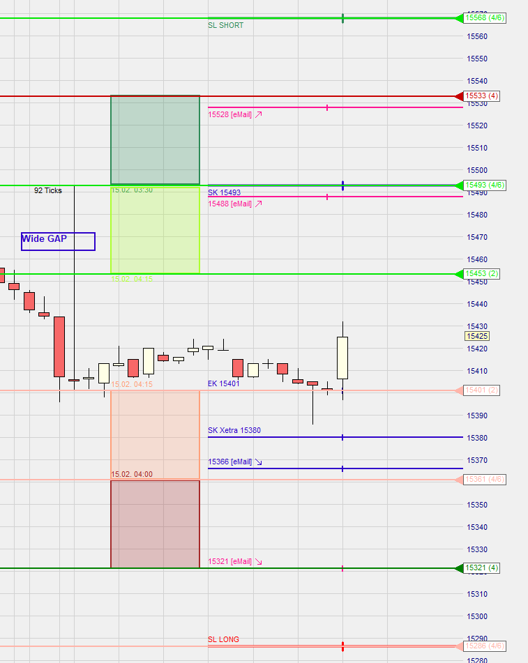 Der Handel beginnt erst ab 9:00h (Eröffnung XETRA DAX.) Der Einstieg muss charttechnisch korrekt sein und durch eine 15M Candlestick-Kerze unter dem Eröffnungskurs für Long Positionen und über dem Eröffnungskurs für Short Positionen bestätigt werden."