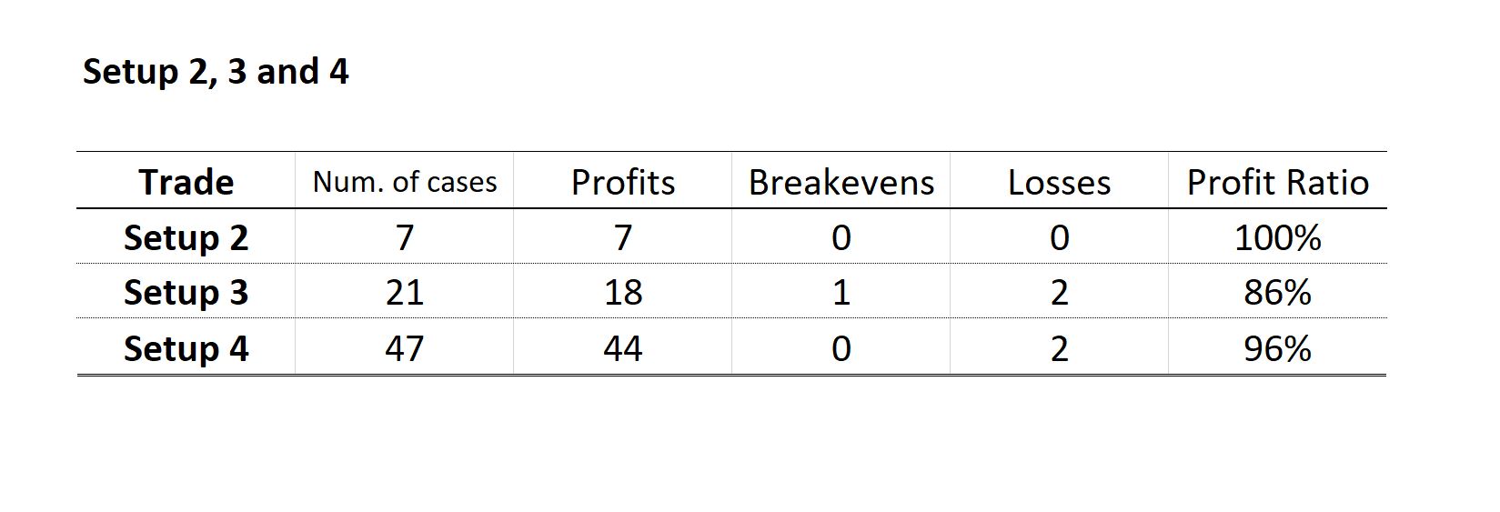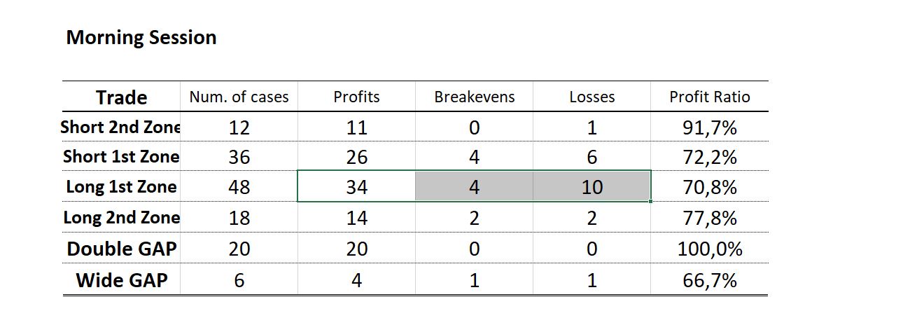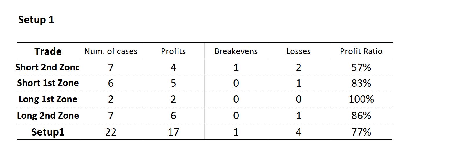 Ich habe eine parallele Studie auf der Grundlage der Erfolgs- und Misserfolgswahrscheinlichkeiten und der Daten, die Georg jede Woche auf VTAD hochlädt, erstellt. In dieser Studie habe ich den durchschnittlichen Gewinn pro Handel und die mathematische Erwartung für jede der Zonen und Setups, aber im Gegensatz zu der Berechnung, die Georg vorgenommen hat, habe ich sie für einen einzelnen Vertrag durchgeführt. Der Grund ist ganz einfach: Wenn jemand beschließt, seine Positionen zu erhöhen, weil das Modell Gewinne anzeigt, muss er nur die Einheit mit der Anzahl der Kontrakte multiplizieren.