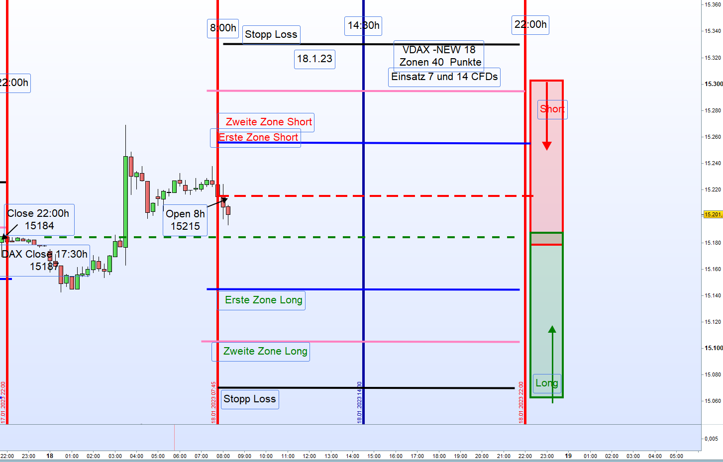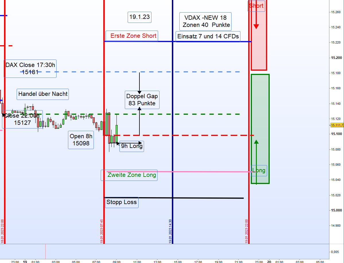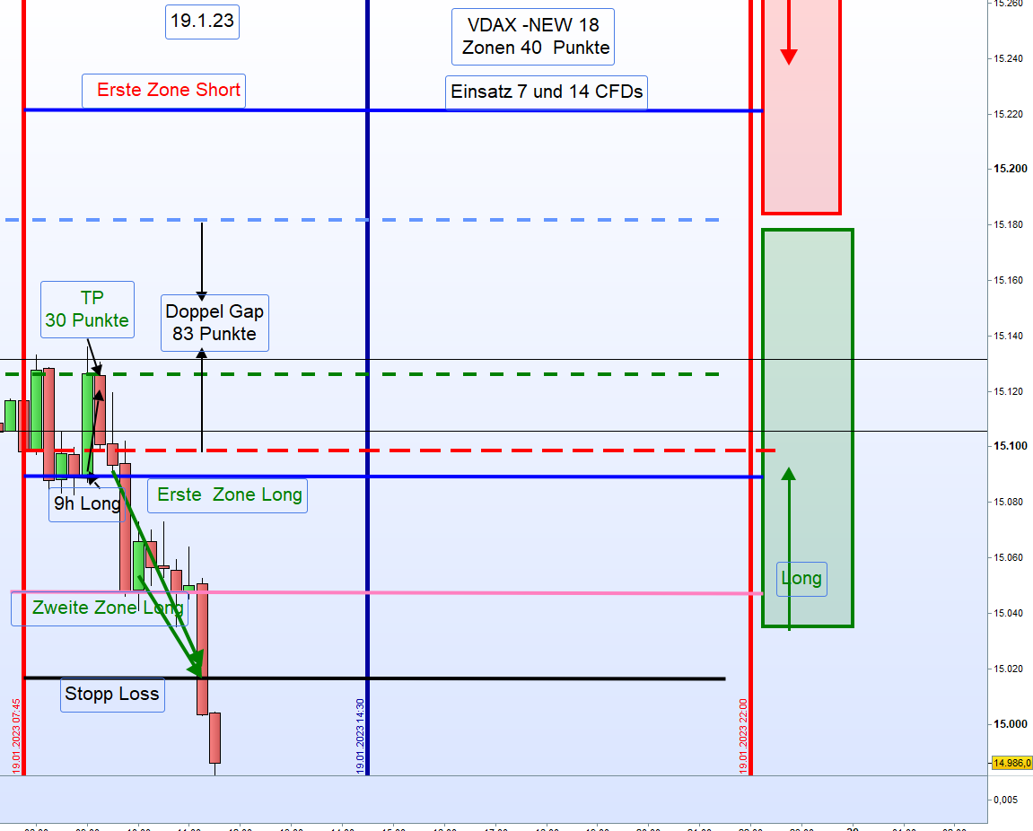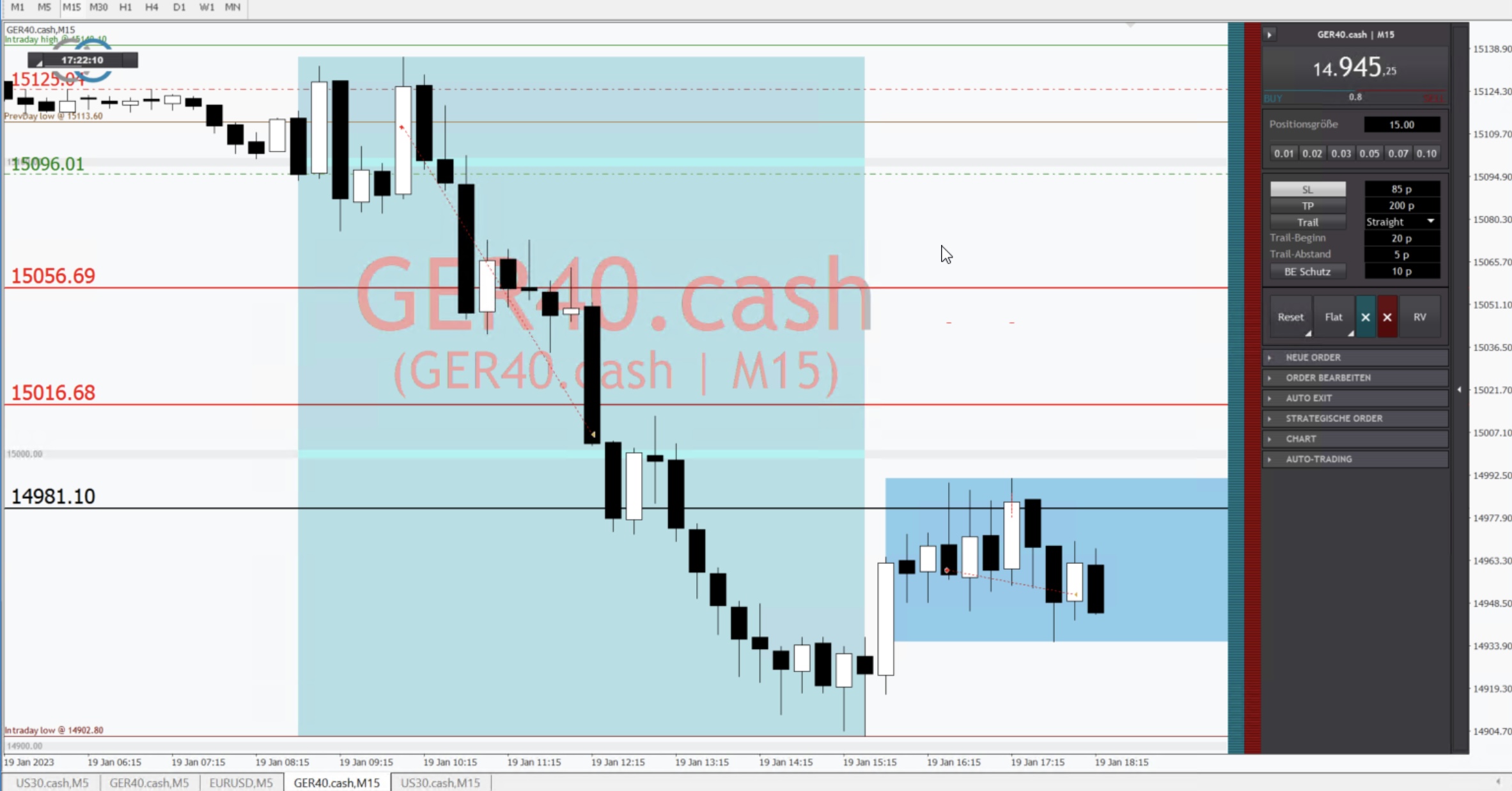 Da der DAX Close von gestern 22.00 Uhr nicht wirklich per 15M Schlusskurs überboten wurde, habe ich das als „Trendtag-Short“ interpretiert und einen SHORT-Trade bis zur runden 15.000er Marke gehalten. Da keine Korrektur bis zur zweiten Zone erfolgte (also keine Range-Erweiterung), ein zweiter Versuch am Nachmittag - nach 5 Kerzen mit ca. 10 Punkten Gewinn abgebrochen.